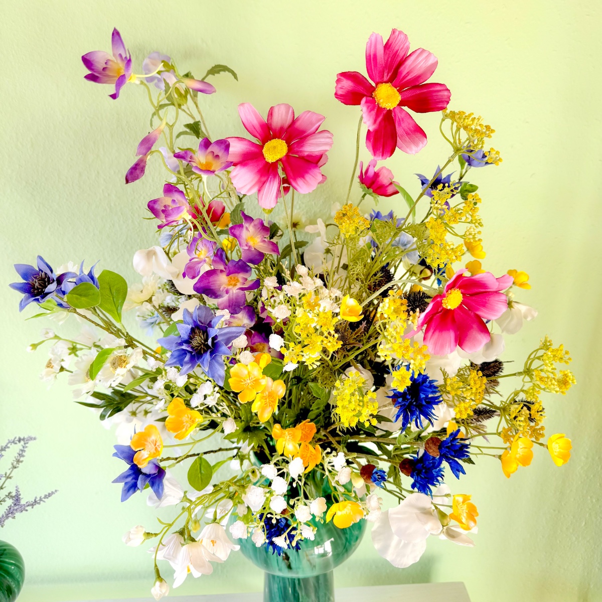 Playful. Fresh. Full of life! Sometimes it is ideas that have already been realised that provide new inspiration: this bouquet was created in response to a customer’s wish to revive a previous design – and to develop it further entirely according to her own vision. The loosely bound meadow bouquet captures the natural lightness of the original and captivates with its harmonious, vibrant charm. Various blooms come together to form an arrangement that looks as though it were picked at random, yet is designed with great sensitivity. The ensemble is complemented by a separately arranged bunch of lavender in a matching vase, which provides a calm, gentle contrast. A potted Glückstaler plant rounds off the overall look and adds a modern, clean touch – symbolising stability and good fortune. The result is a harmonious interplay of floral lightness and decorative accents – interpreted individually and executed with attention to detail. A look that shows how inspiration can be transformed into something entirely unique – personal, timeless and full of natural beauty. Shop the Look!