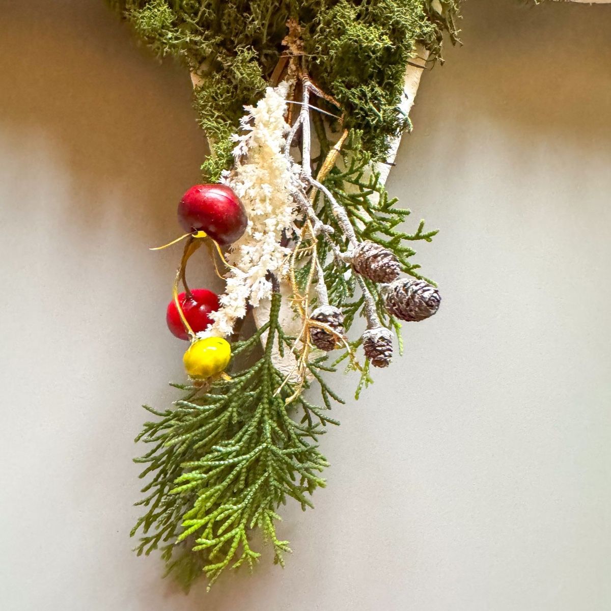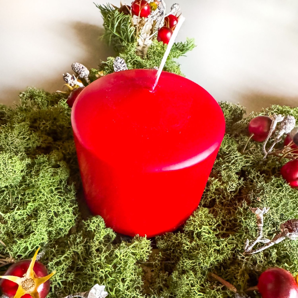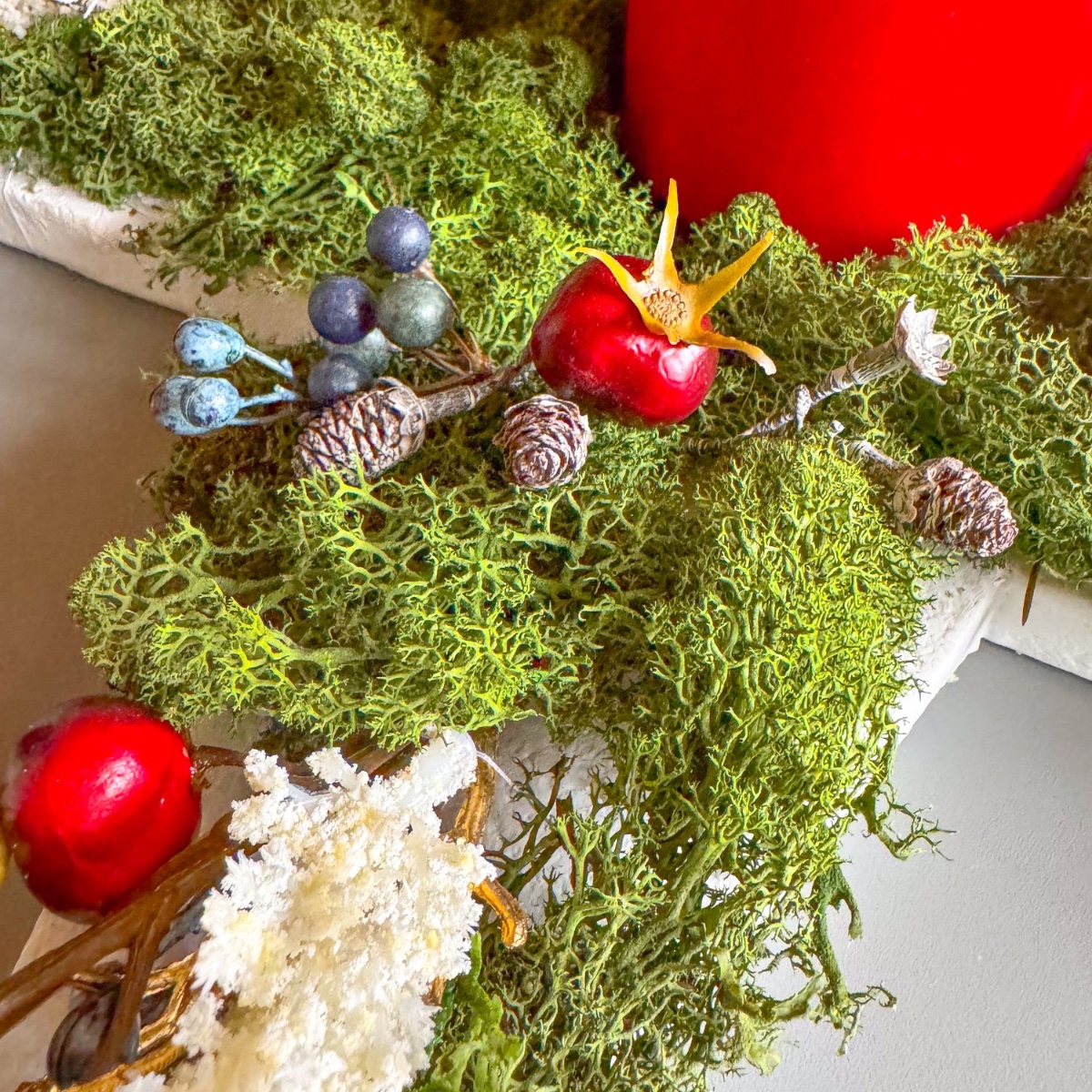 Naturally festive – a star full of warmth! An artfully arranged star-shaped arrangement decorated with rich green moss, fir branches and delicate berry accents. A bright red candle shines in the centre – a luminous contrast that radiates warmth and festivity. The arrangement is an elegant eye-catcher on the dining table or living room table for the winter and Christmas season. Shop the look!