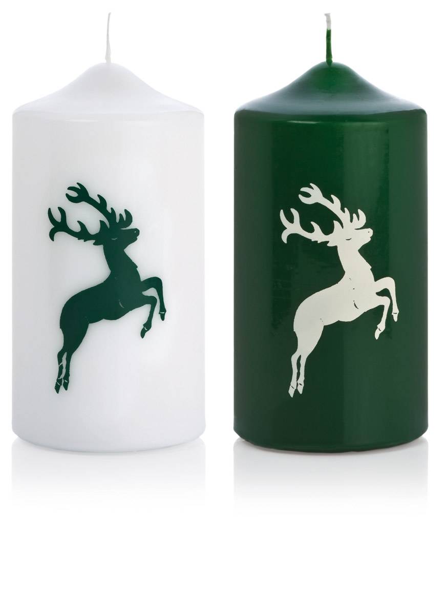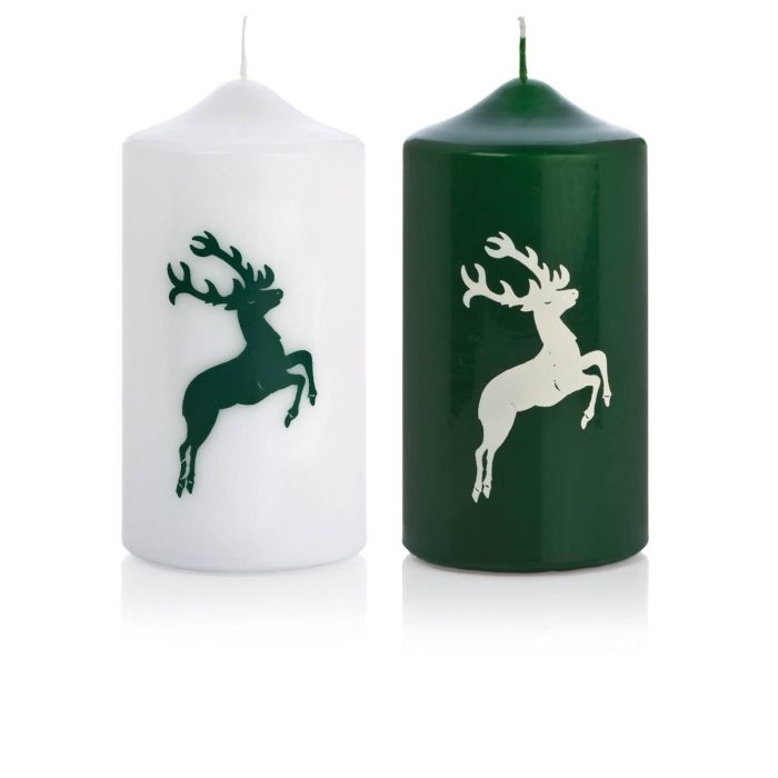 Advent candle DALDI with stag motif, 2 pcs, dark green-white, 6"/15cm, Ø3.1"/8cm, 69h - Made in Germany