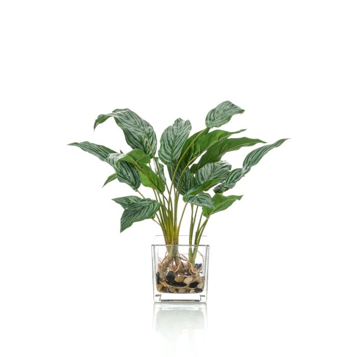 The fake Aglaonema ADRIK in a decorative glass with roots and gravel suits any interior design style and immediately catches the eye.