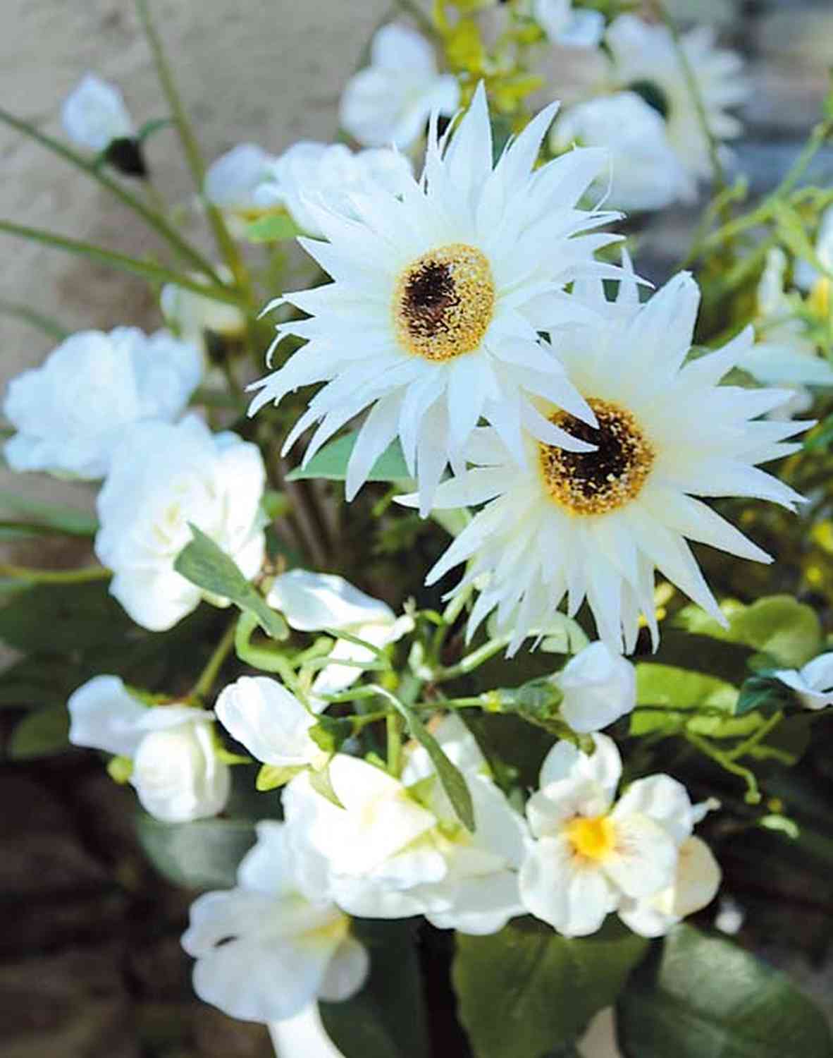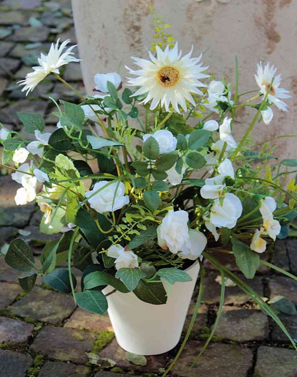 - In white colour consisting of various flowers: gerberas, ranunculus, pansies, lathyrus