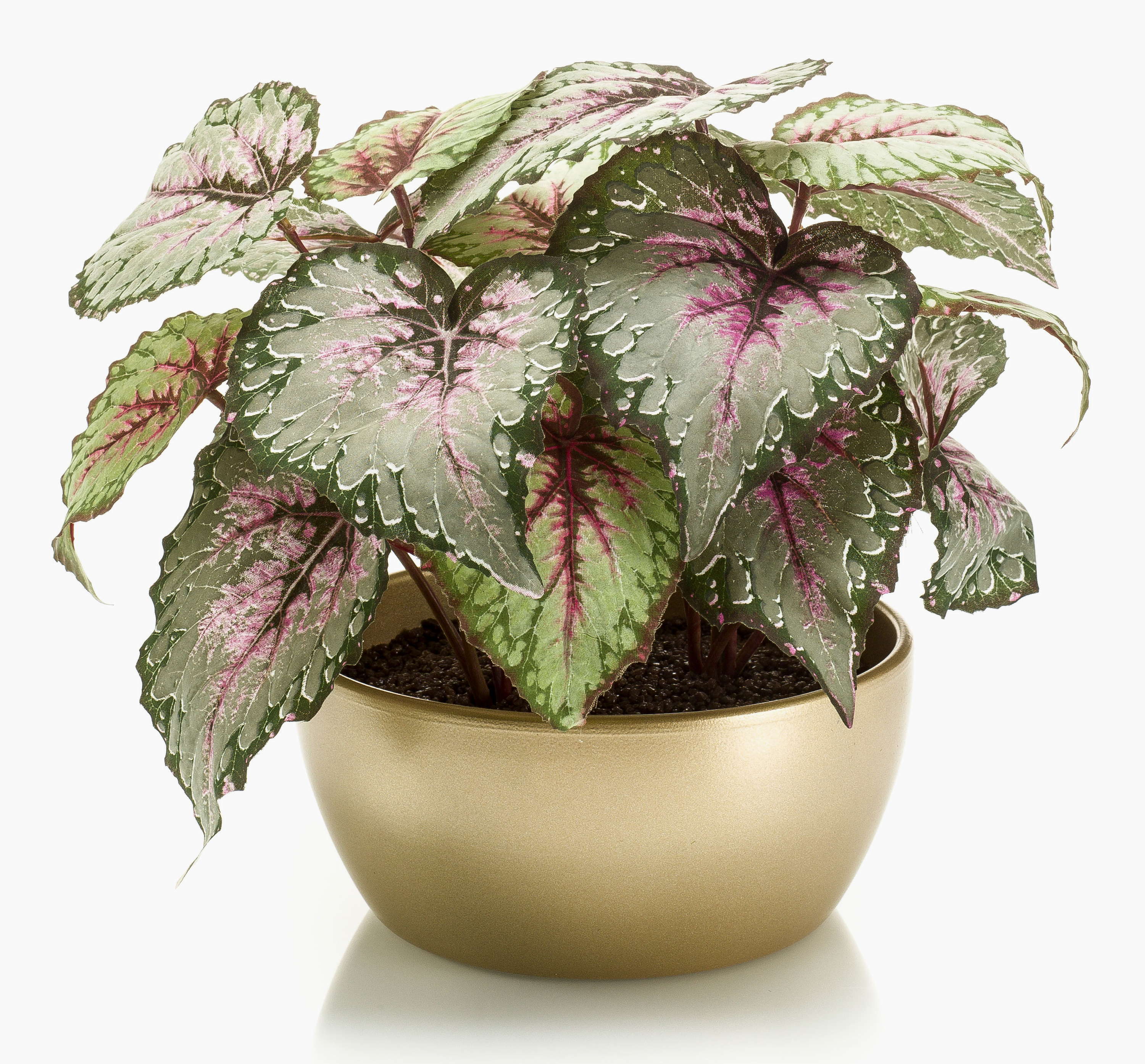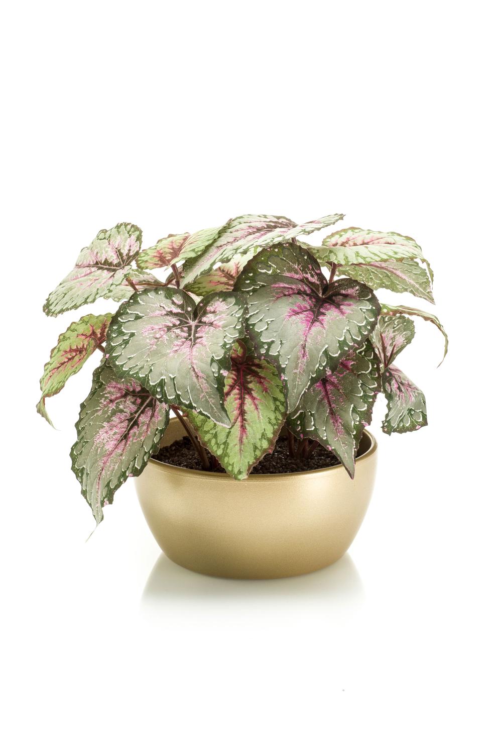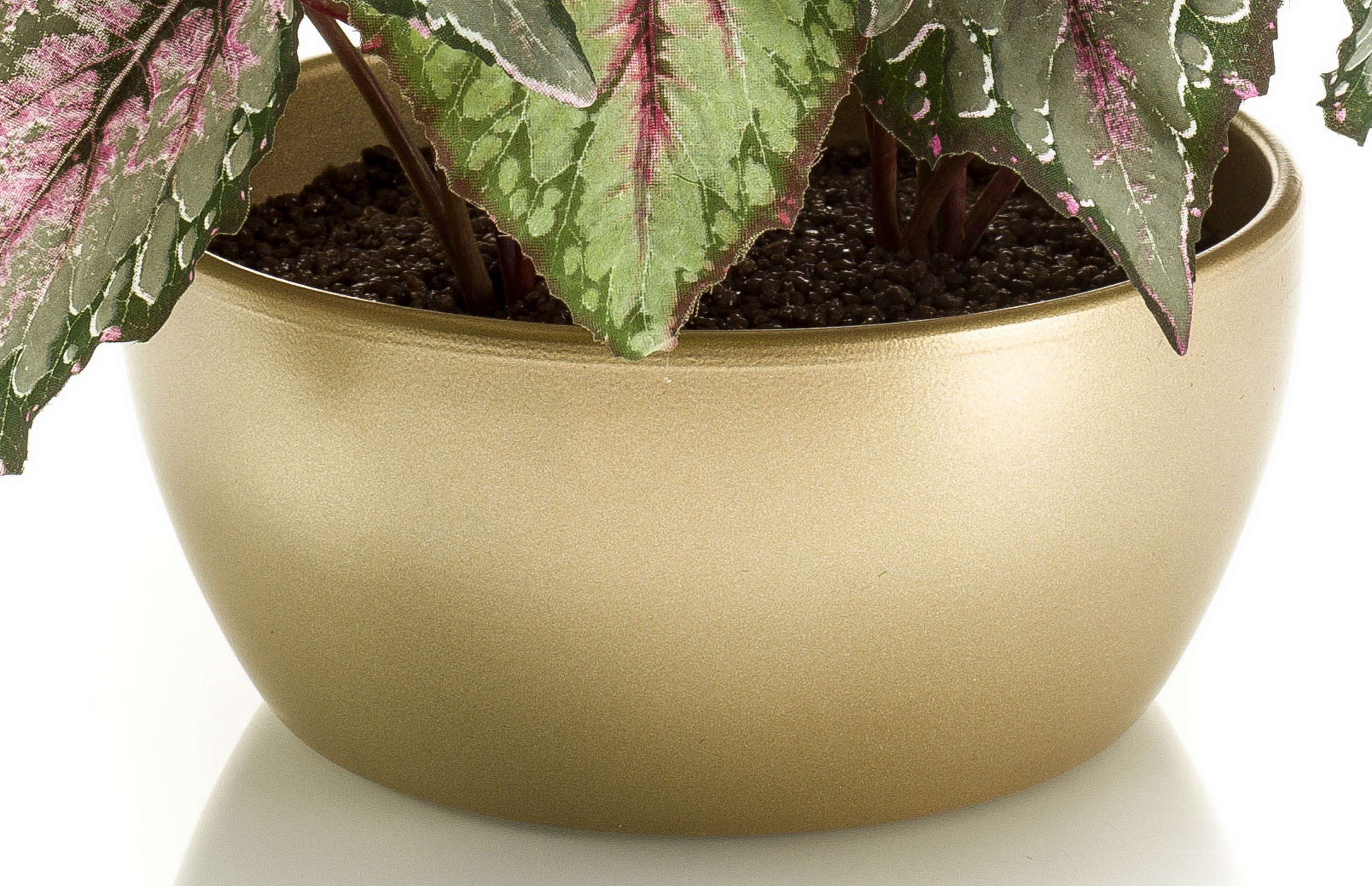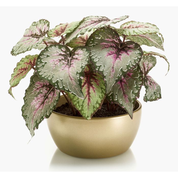 Artificial begonia rex KATRICE in golden ceramic bowl, purple-green, 10"/25cm