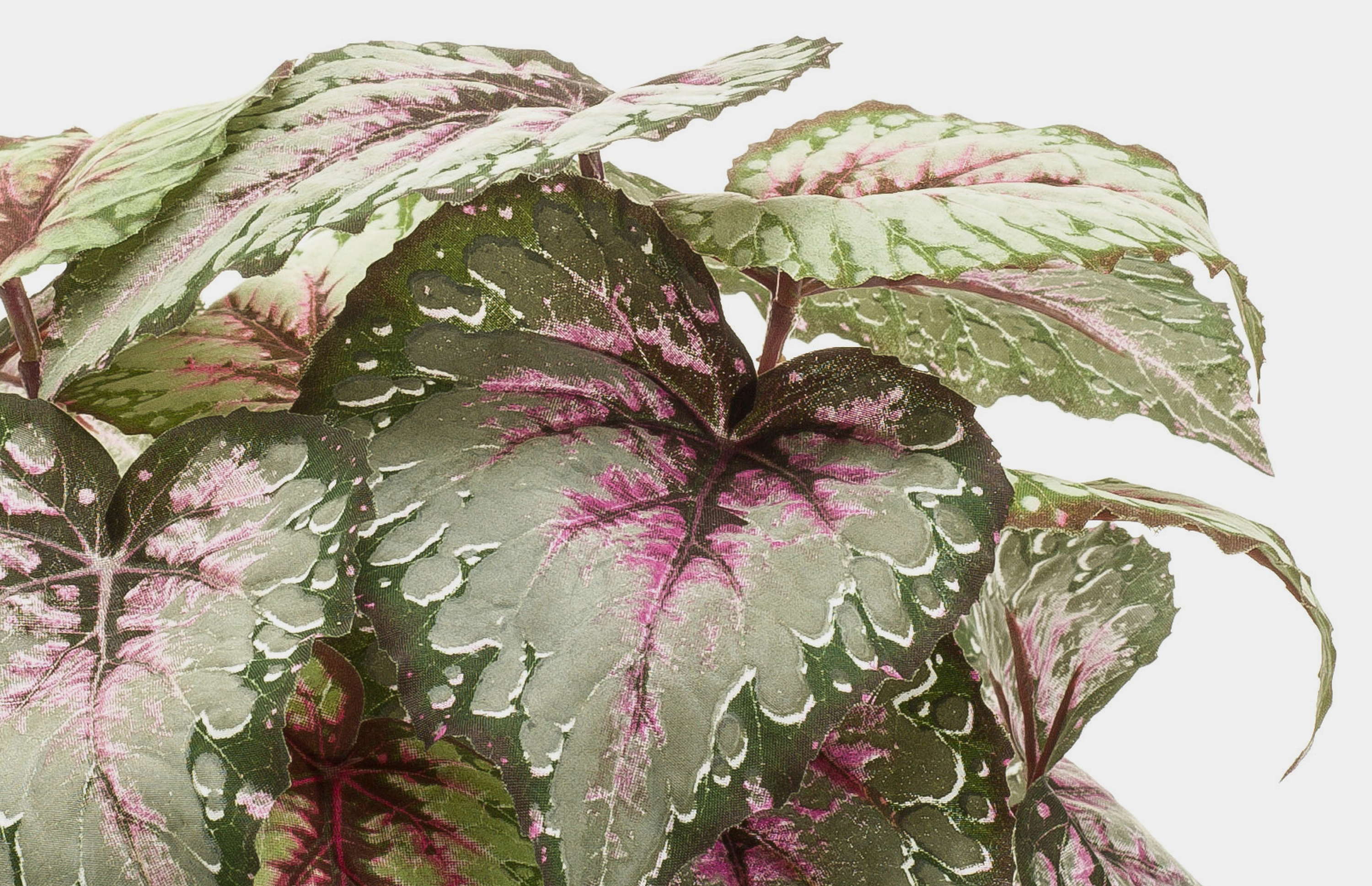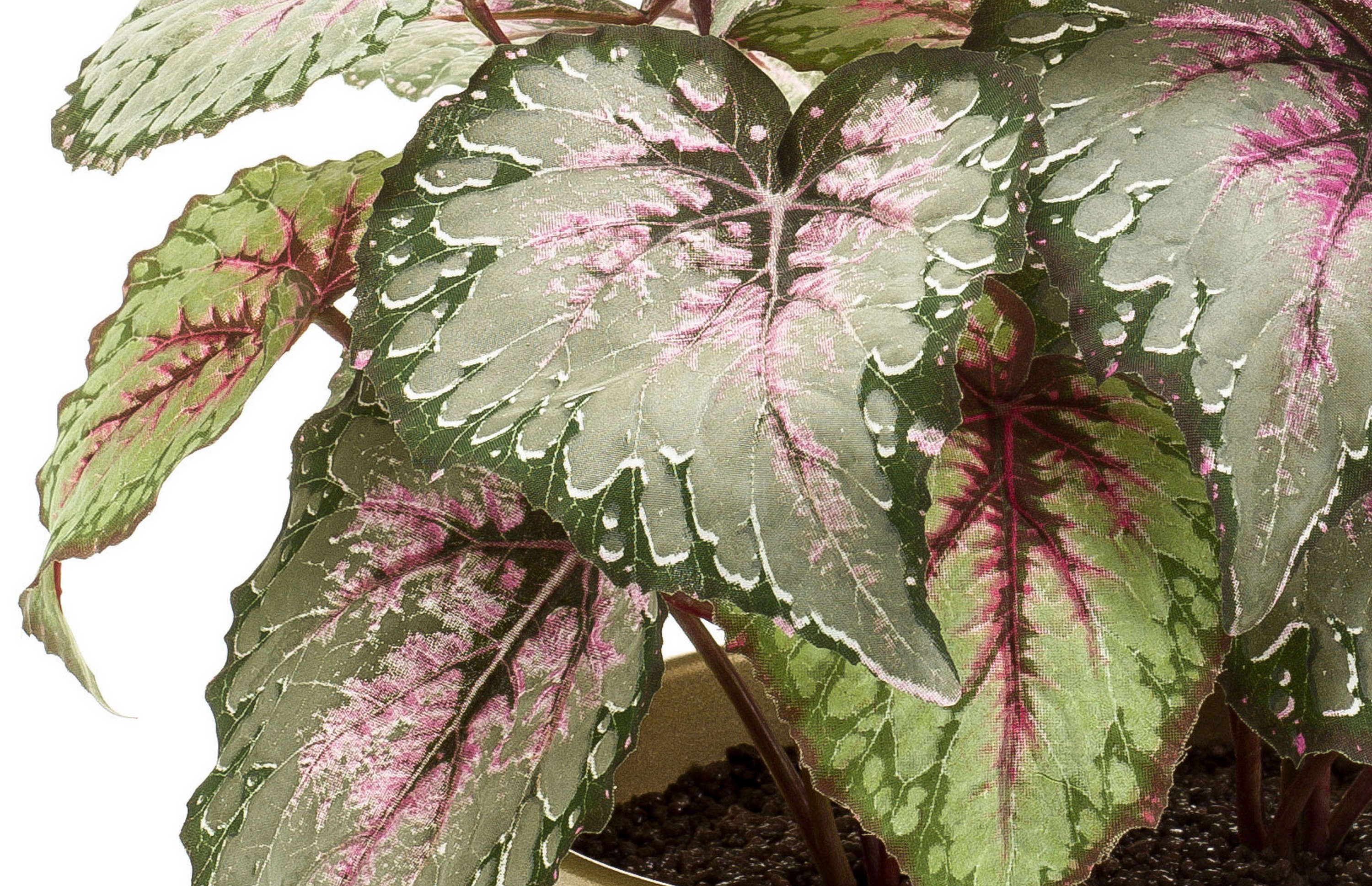 The fake begonia rex KATRICE in colour violet-green comes in a planter and has a height of approx. 25 cm.