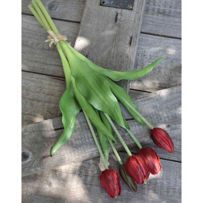 The artificial bunch of tulips LONA in colour red with a total height of 14"/35 cm and a total diameter of 6"/15 cm will add a touch of style to your living room.
