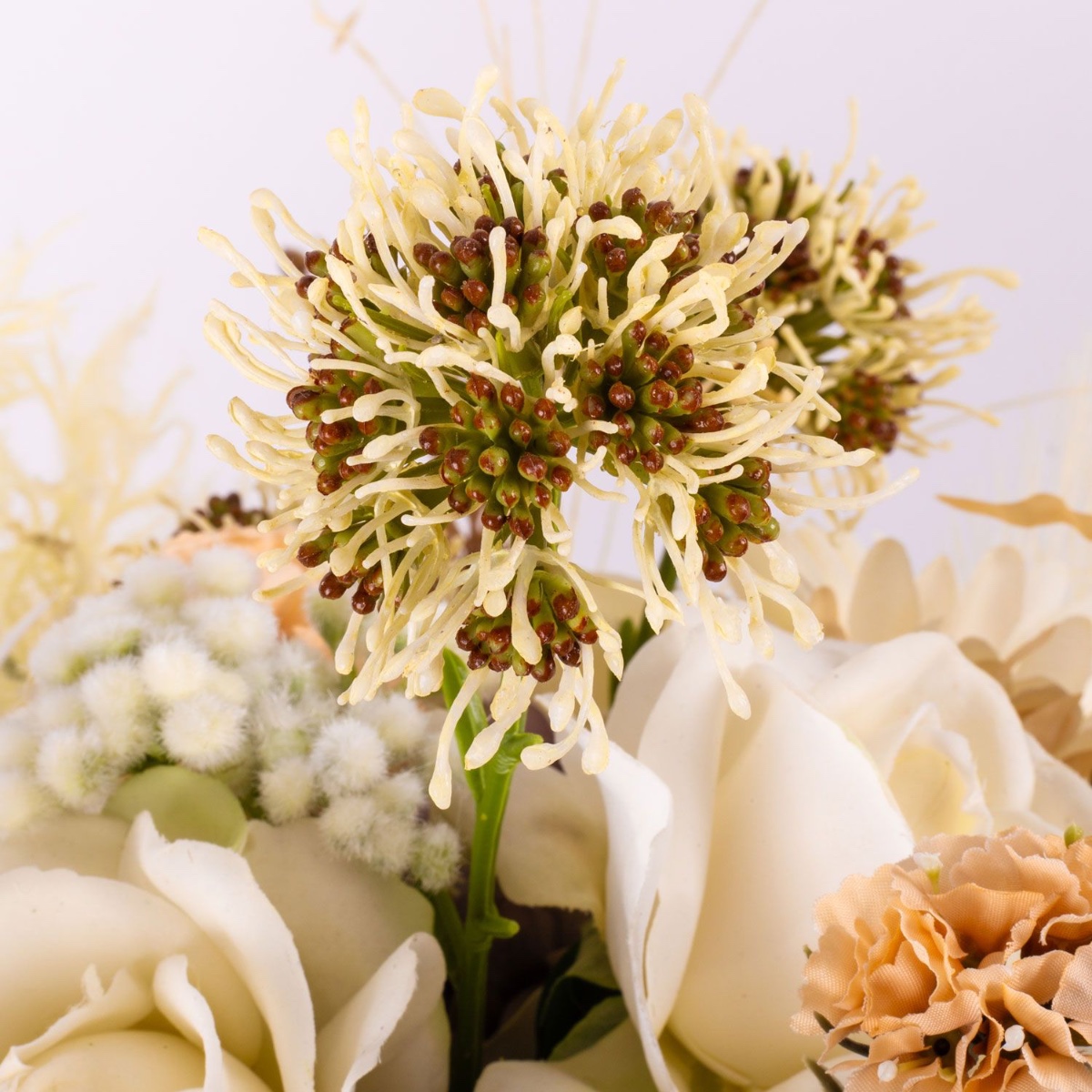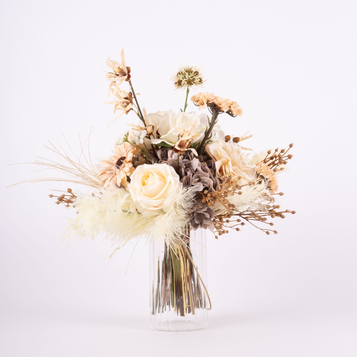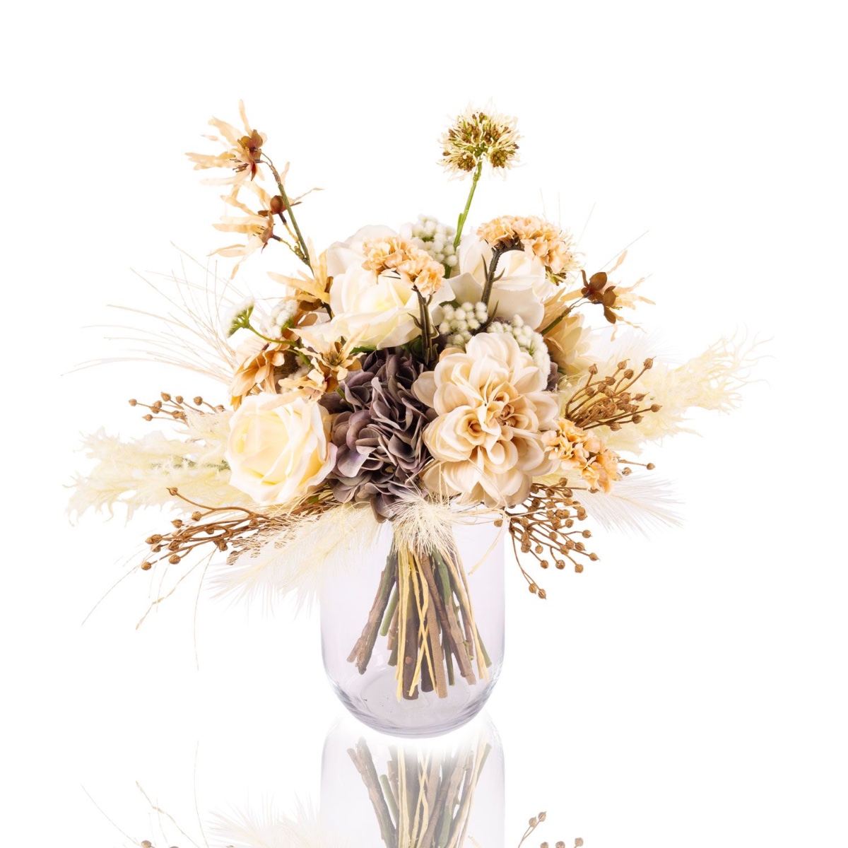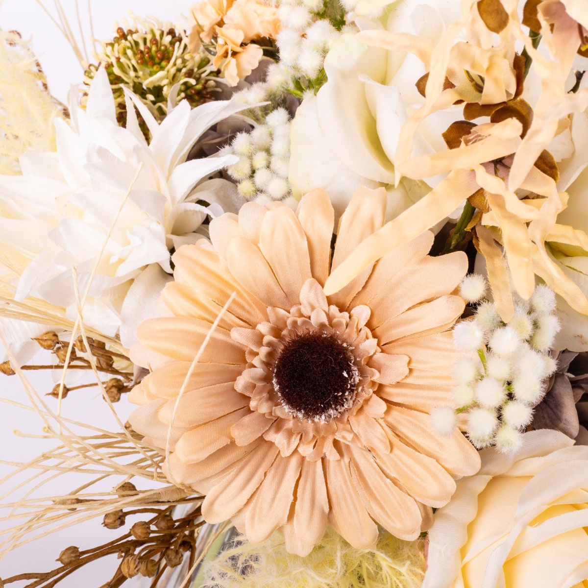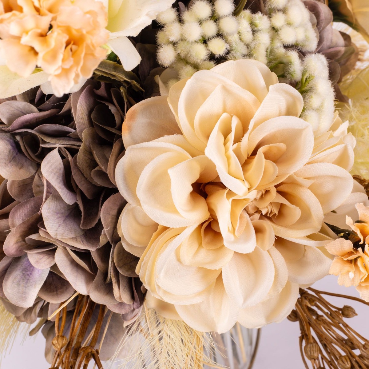The artificial bouquet RAWENNA is visually reminiscent of a dried bouquet, almost a bit nostalgic. However, it is not as fragile as real dried flowers, a clear advantage for artificial flowers. Earthy colours such as beige and cream are used in the bouquet to create the impression of dried material. This bouquet is composed of lush hydrangeas covered by roses, gerberas and dahlias, but only slightly peeking out. The accessories add excitement and look cheekily out of the bouquet, giving it height. A mix of different panicles, ears and grasses frames the bouquet.