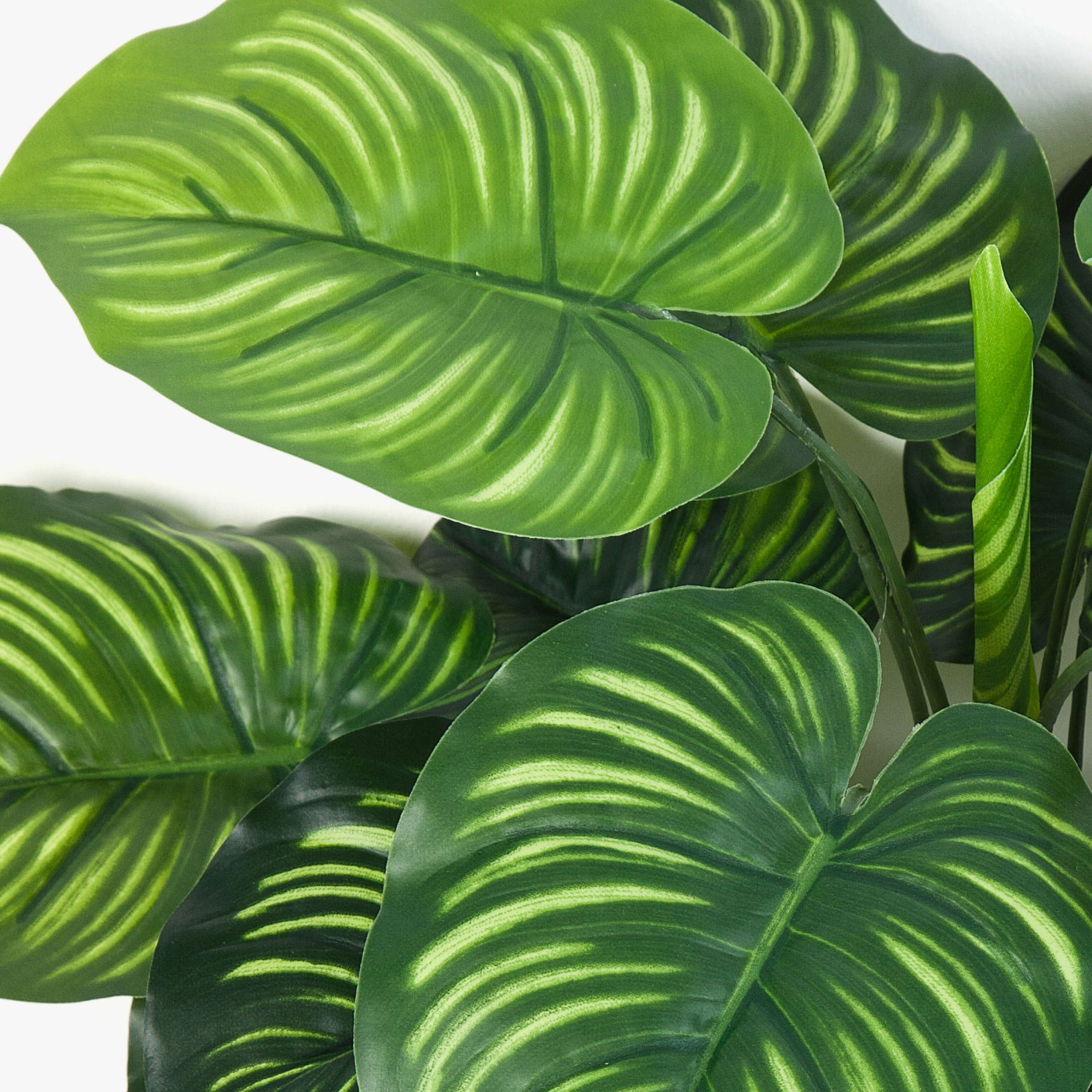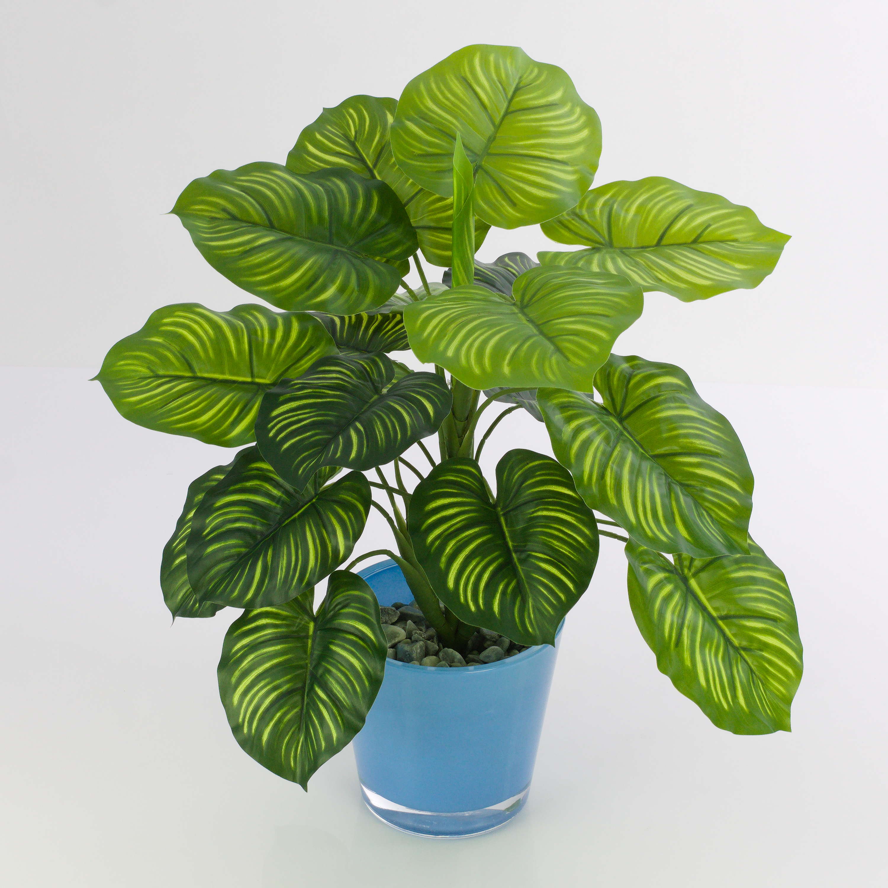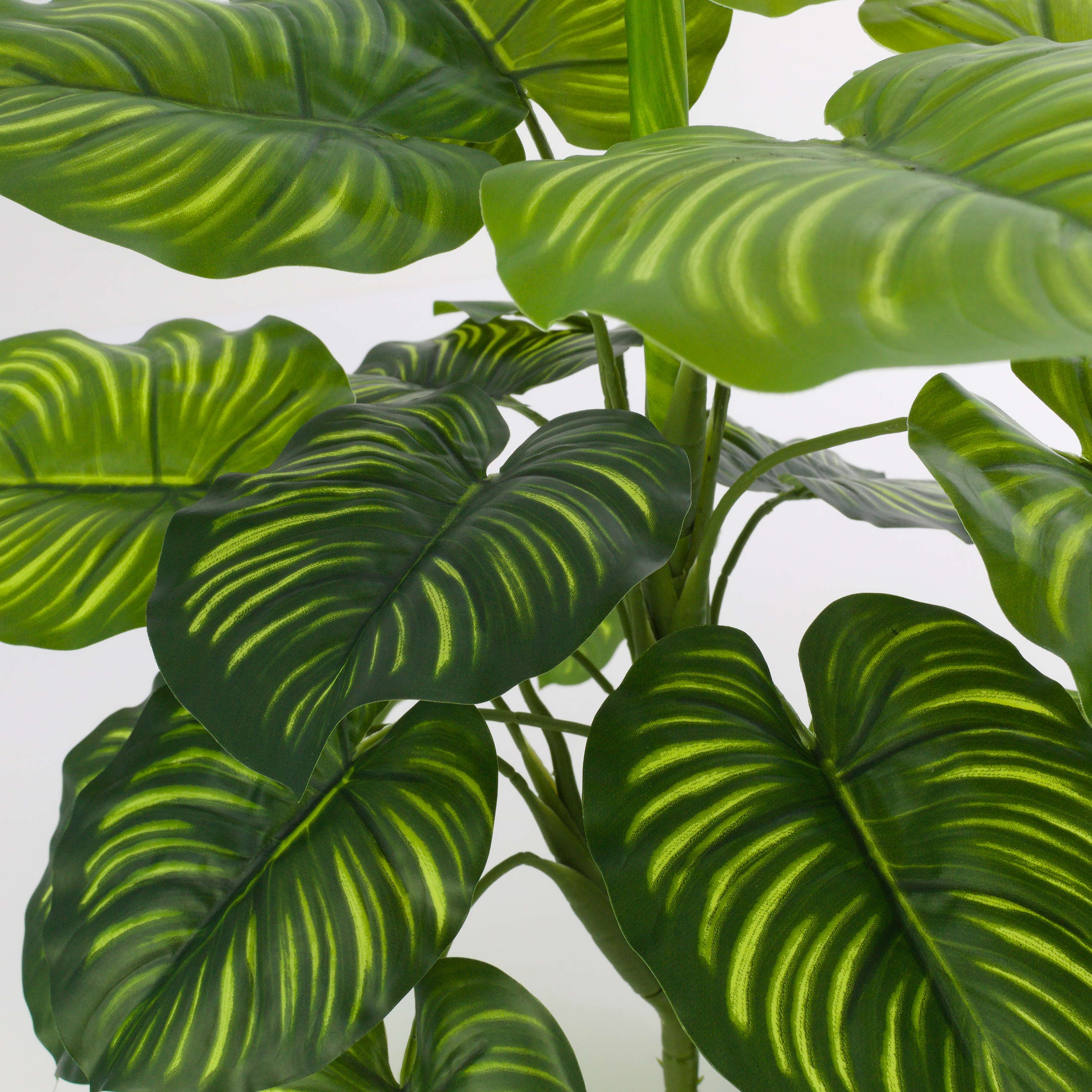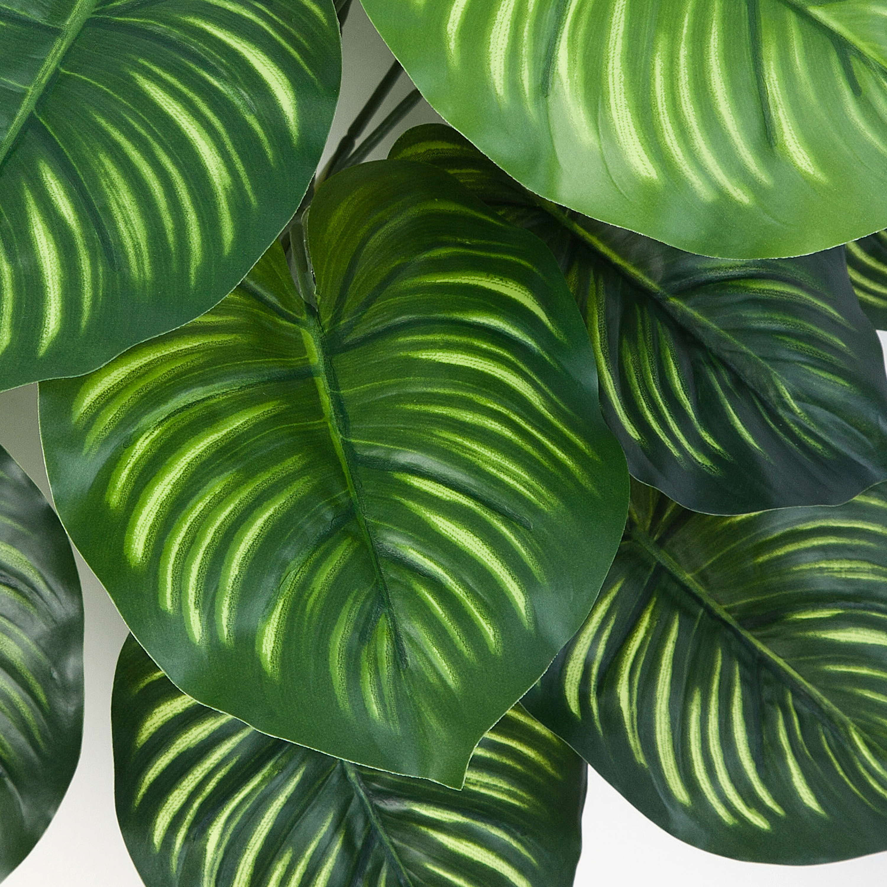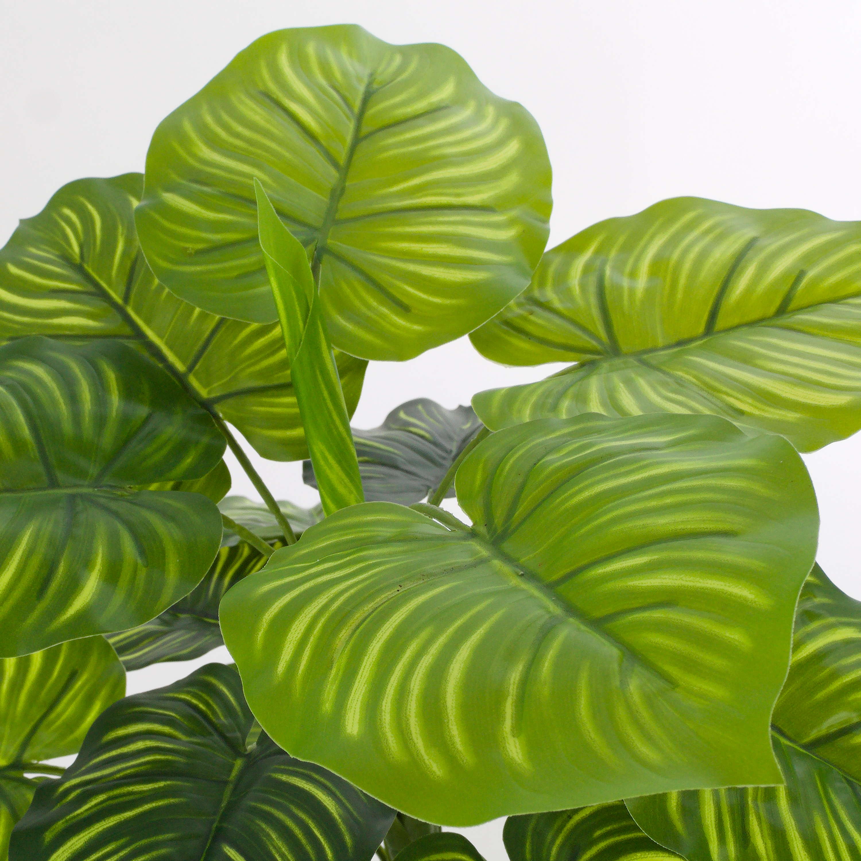 Fake Calathea ULANI appears real by its bright green strip of light on the heart-shaped, round leaves together with the dark green leaf fibres. The artificial peacock plant stands approx. 18"/45 cm high.