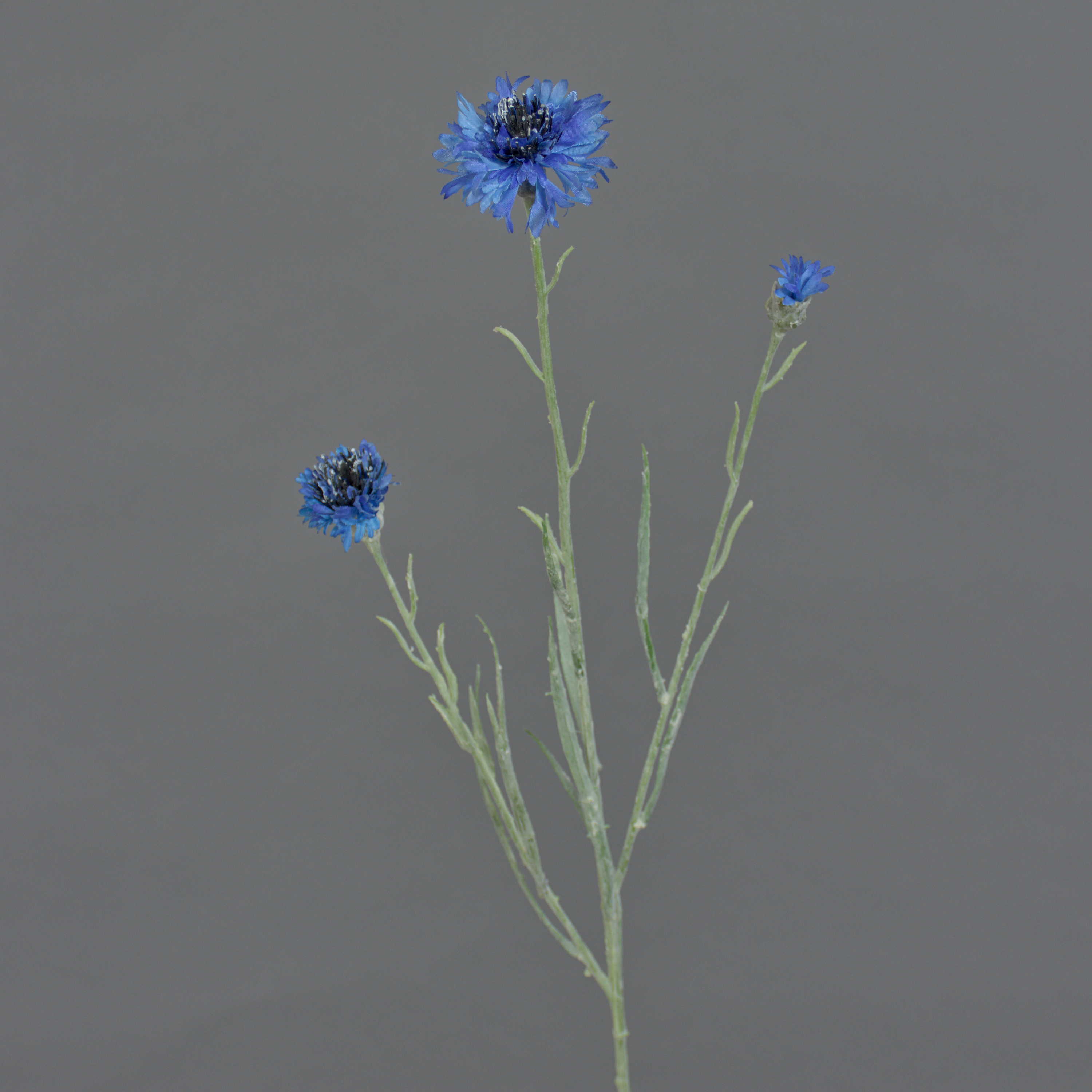 Artificial flower Cornflower KELSIE with two blue blossoms and one bud. The false cornflower has a total length of approx. 28"/70 cm.
