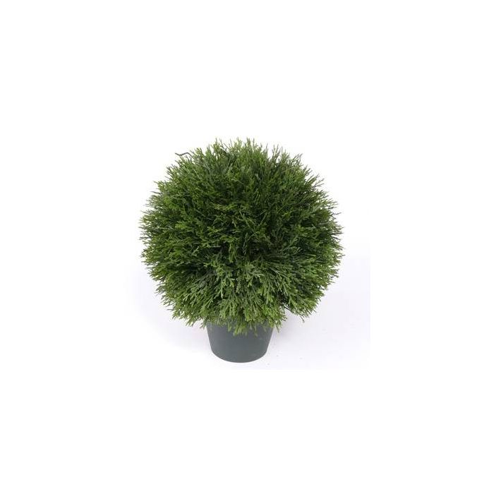 Fake cypress ball in a pot. The beautifully finished ball with its 290 branches has a diameter of 12"/30 cm and stands approx. 16"/40 cm high.