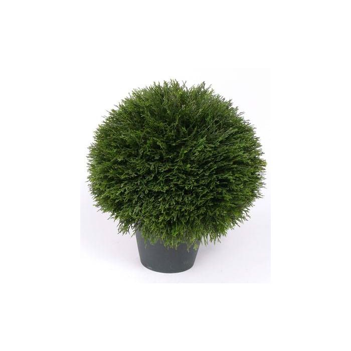 Fake cypress ball in a pot. The beautifully finished ball with its 510 branches has a diameter of 16"/40 cm and stands approx. 18"/45 cm high.