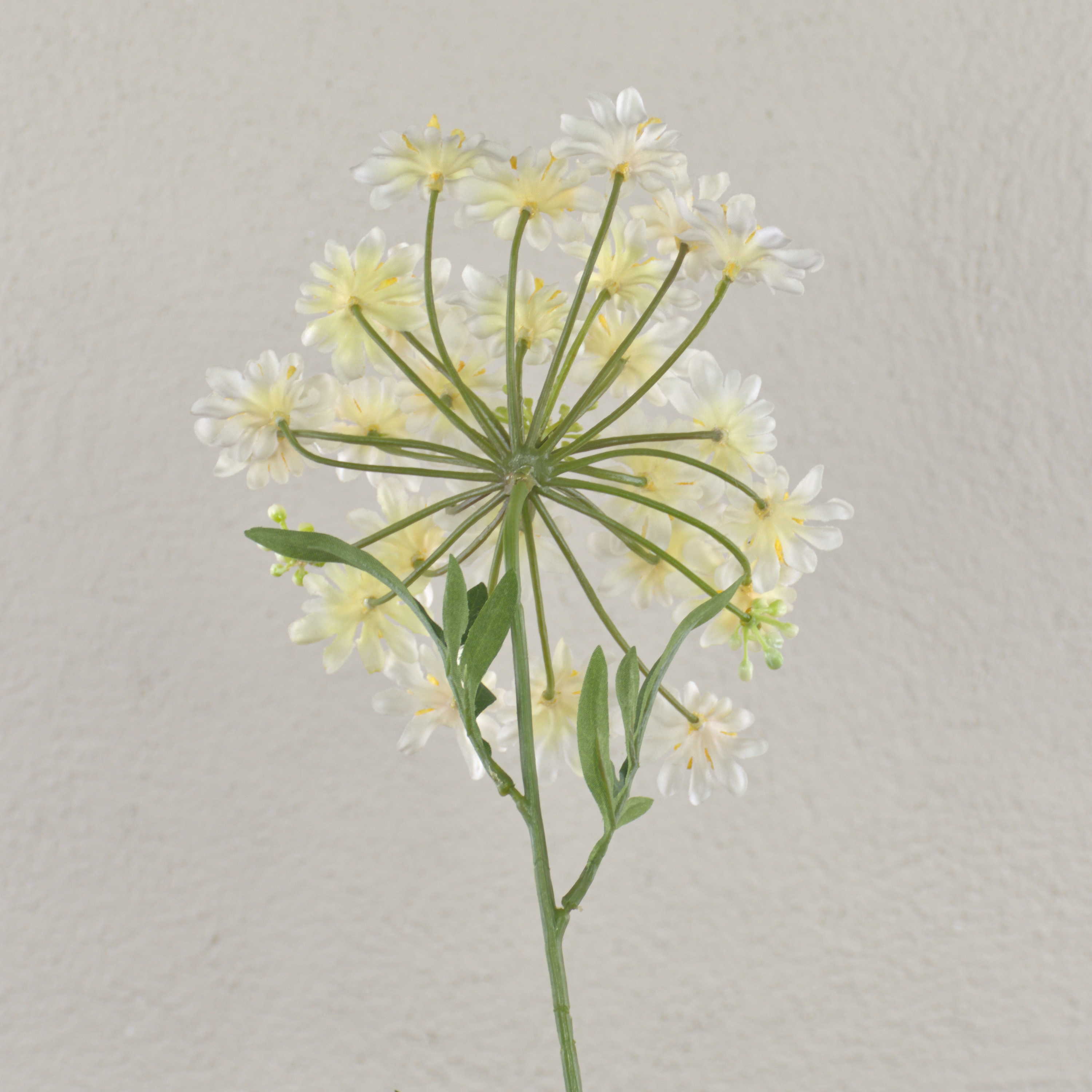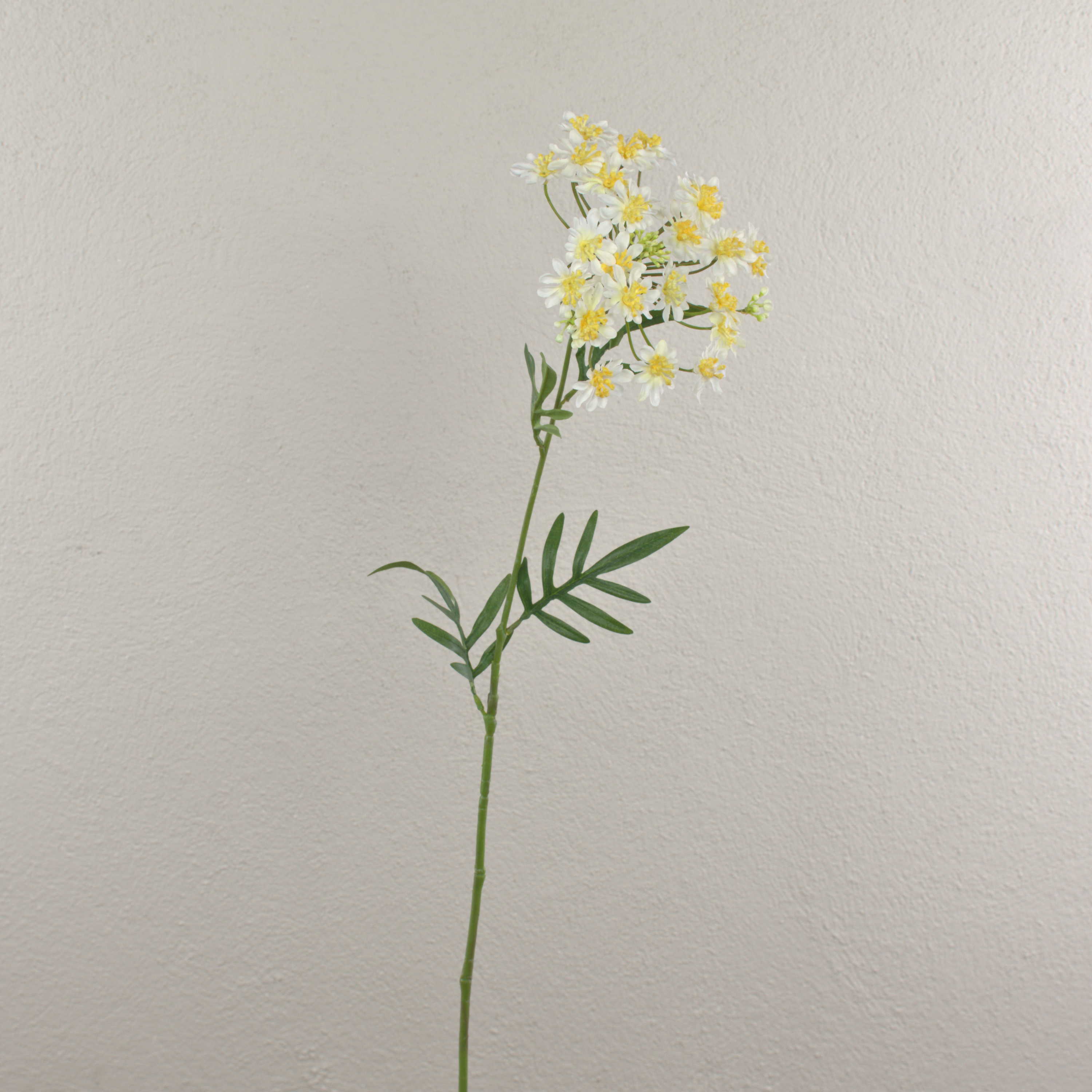 - Flower head with numerous natural looking single flowers, on stem several pinnate leaves