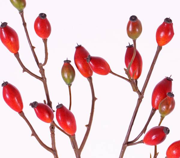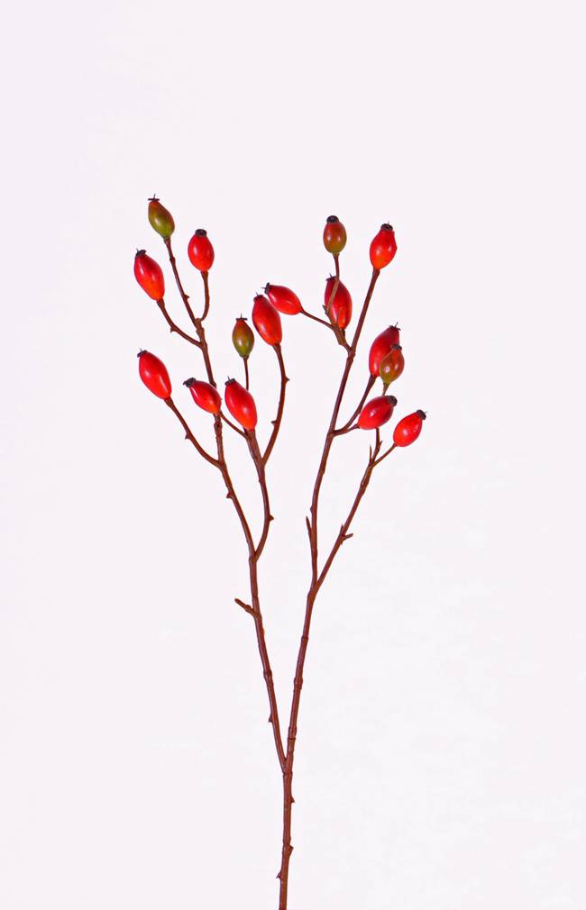 False dog rose branch EDITH with approx. 16 fruits. The artificial branch has a total length of approx. 20"/50 cm and will be suitable as an autumnal decoration e.g. in a transparent single stem vase.