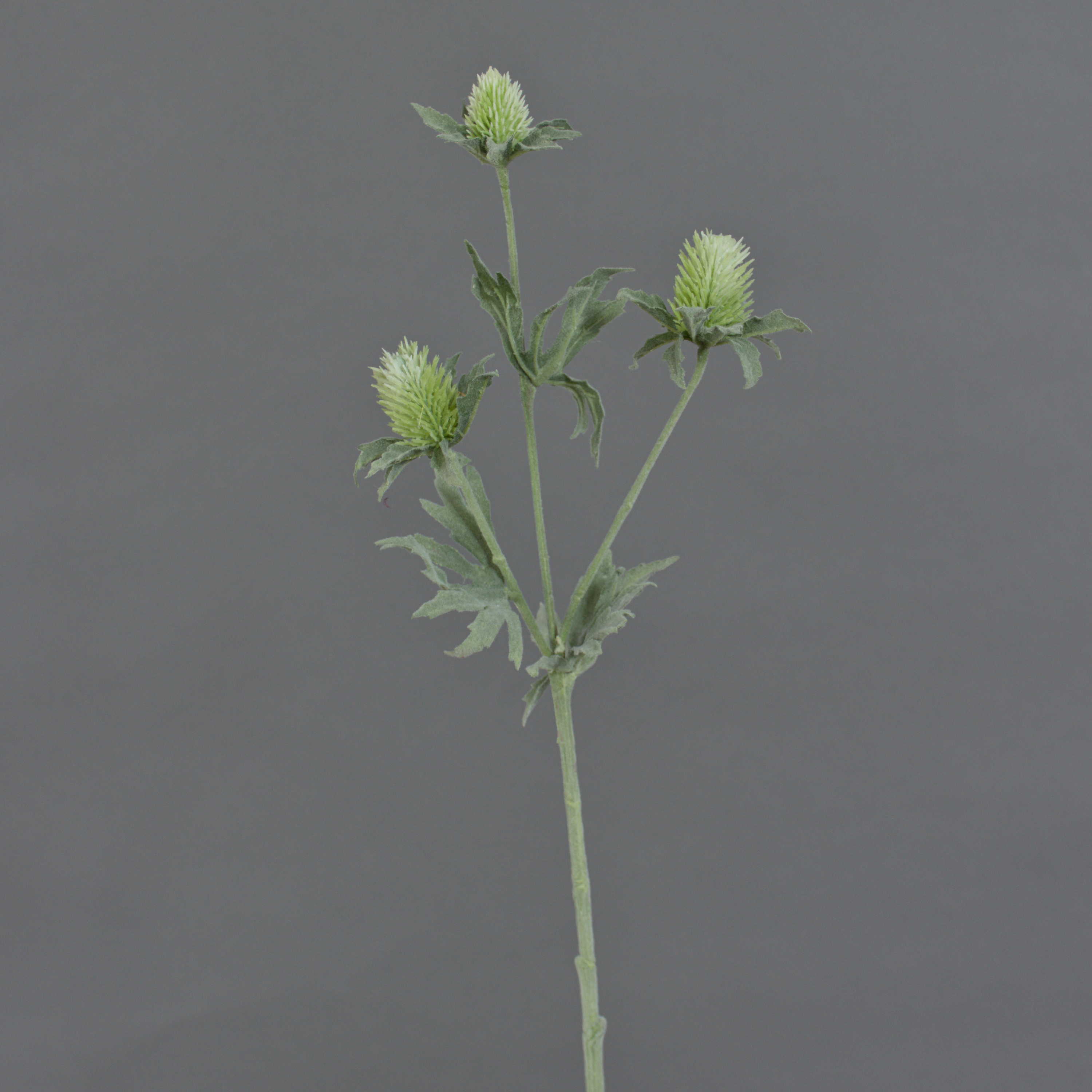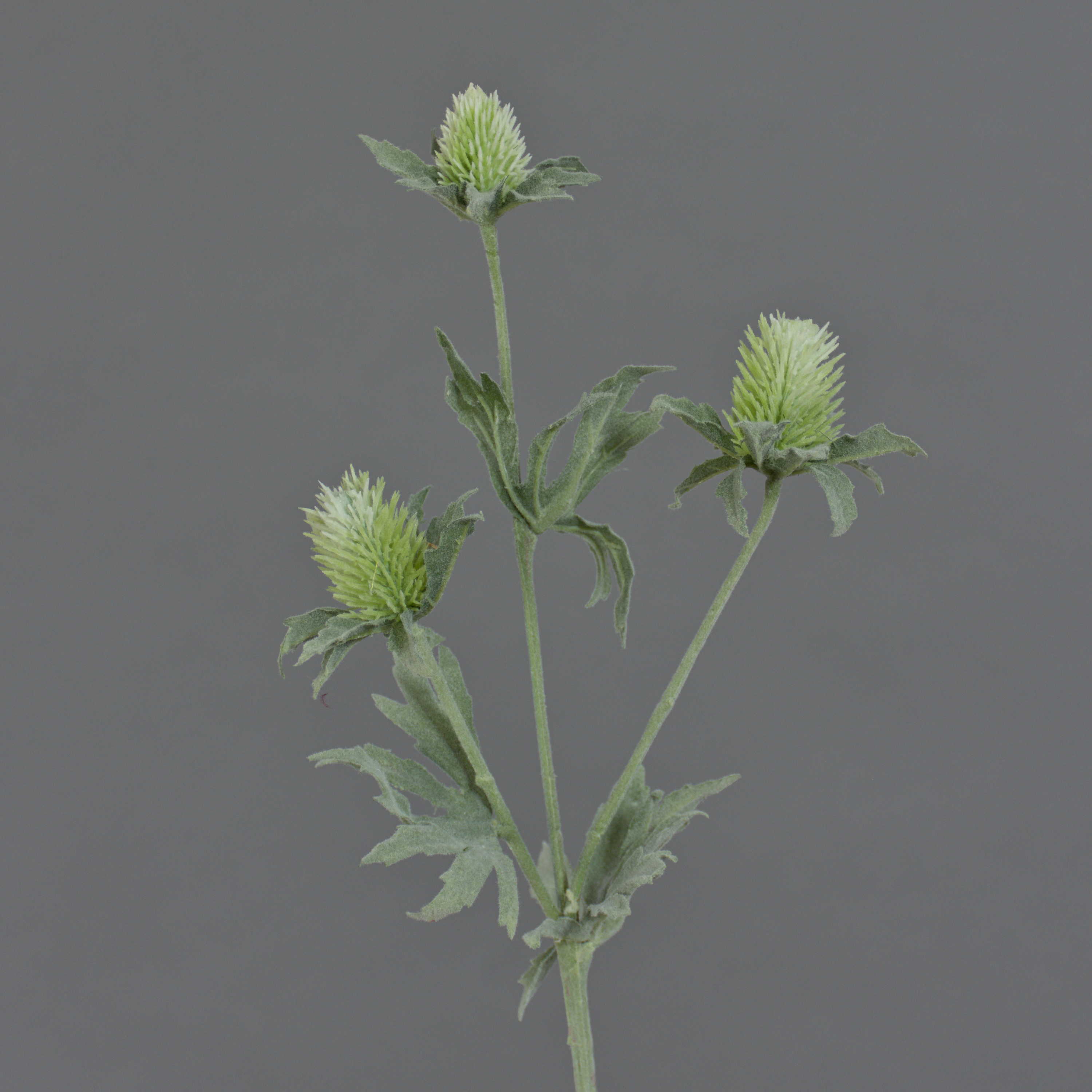Artificial spray SVEA is adorned with 3 thistles in colour green. The artificial eryngo, also known as flat sea holly (Eryngium planum) measures approx. 16"/40 cm in length and is characterised by leaves in true-to-detail look.