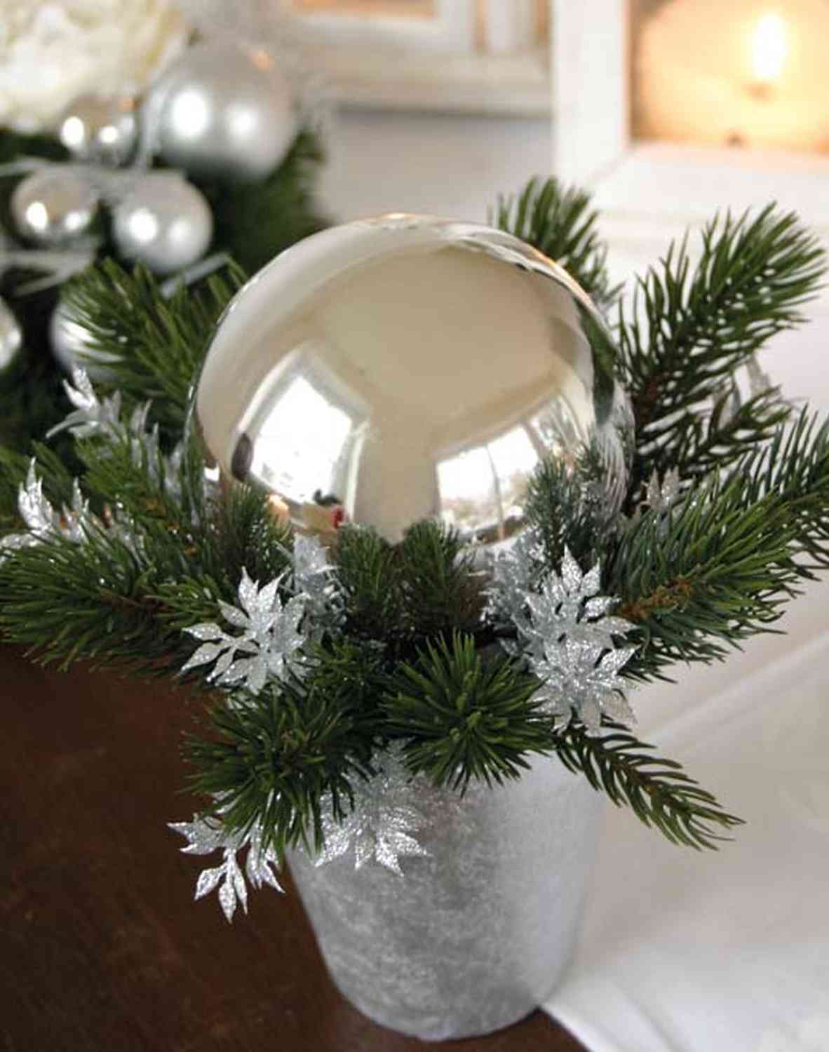 Artificial fir arrangement SKELLA in decorative pot, ball, silver, 8"/20cm
