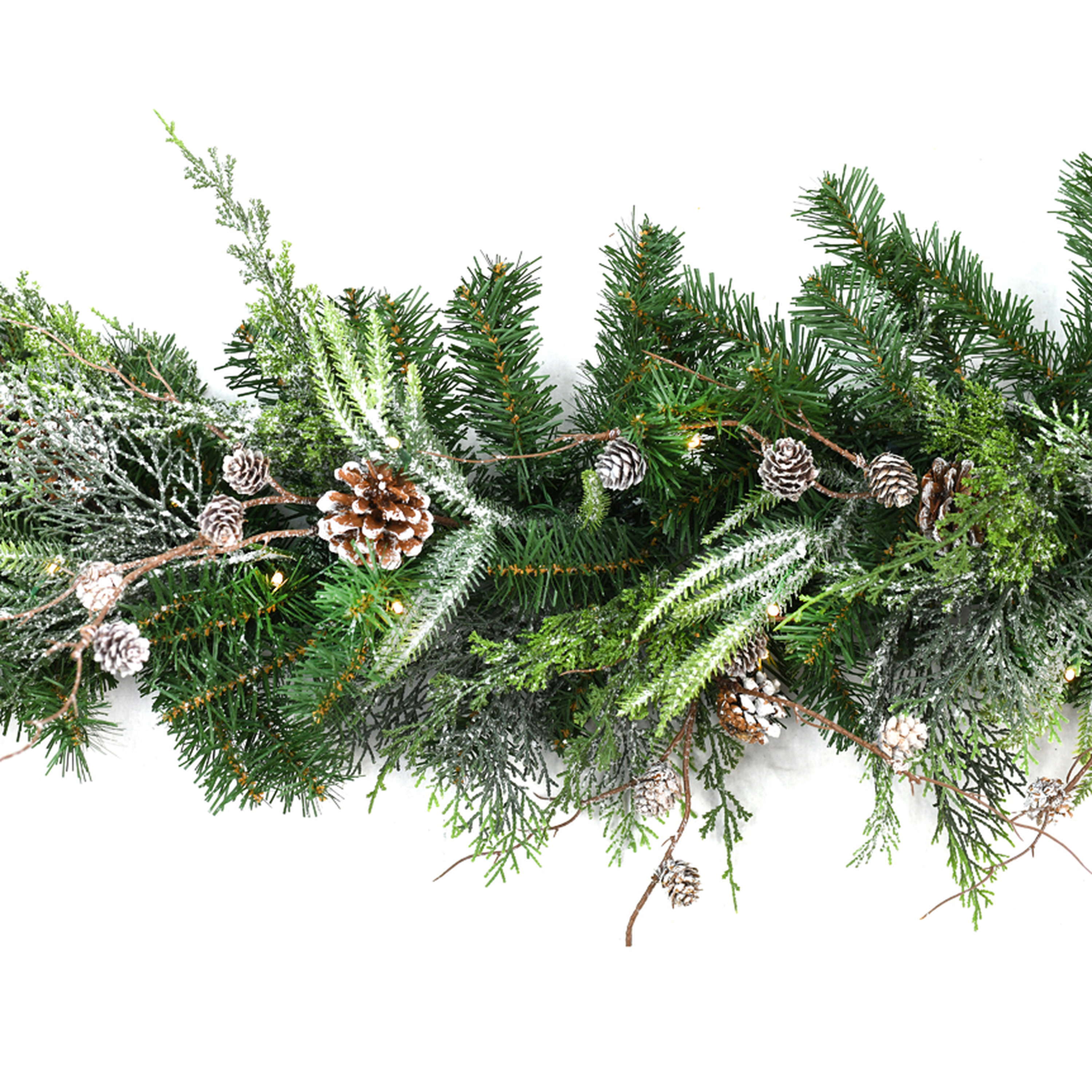 - Snowy artificial fir garland with cones and LEDs for your Christmas decoration
