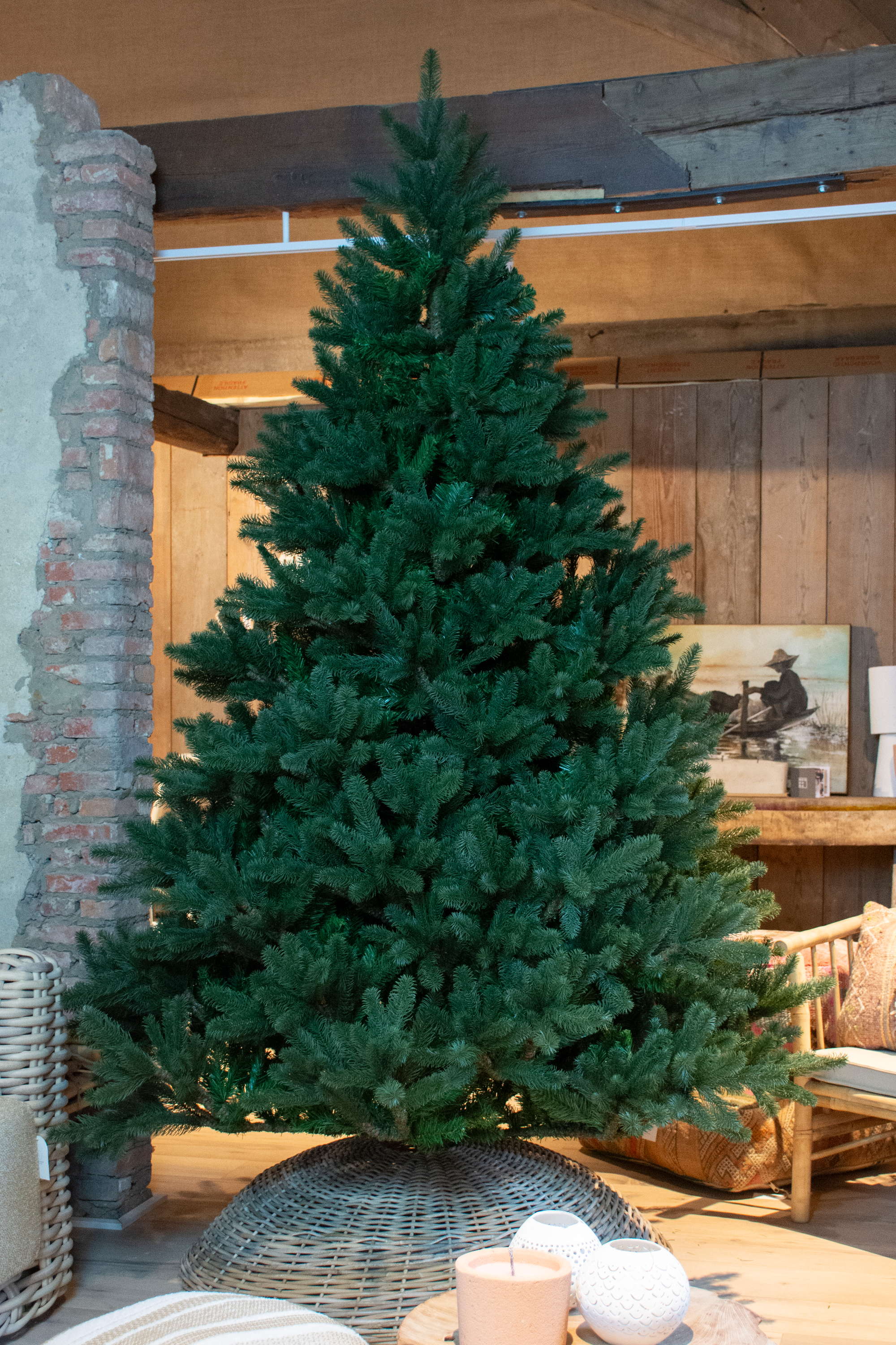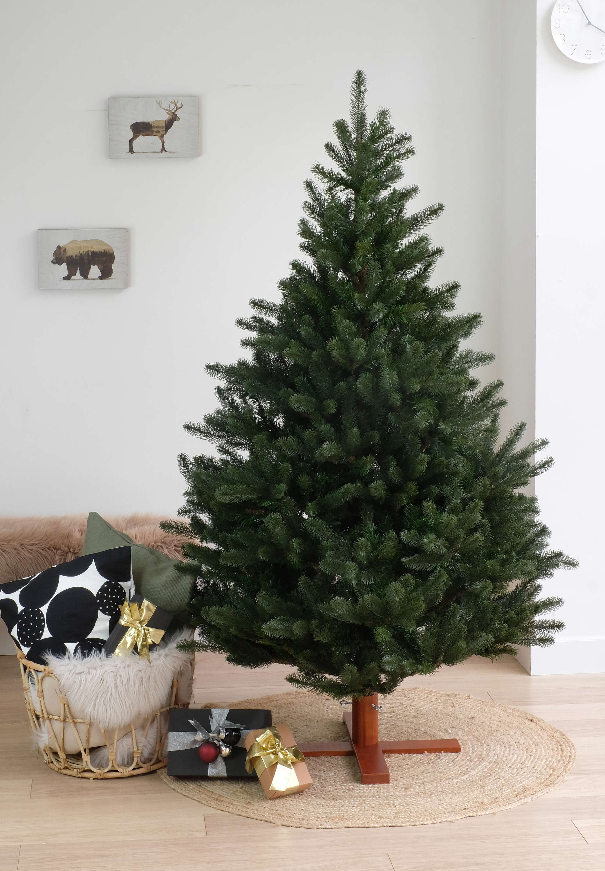 Fake fir tree/Christmas tree LYON SPEED DELUXE in colour green with wooden stand consisting of PE needles. The approx. 245 cm high Christmas tree has a diameter of approx. 165 cm and will be suitable as decoration for the living room at home or for restaurants, shop windows, trade fair stands, etc.