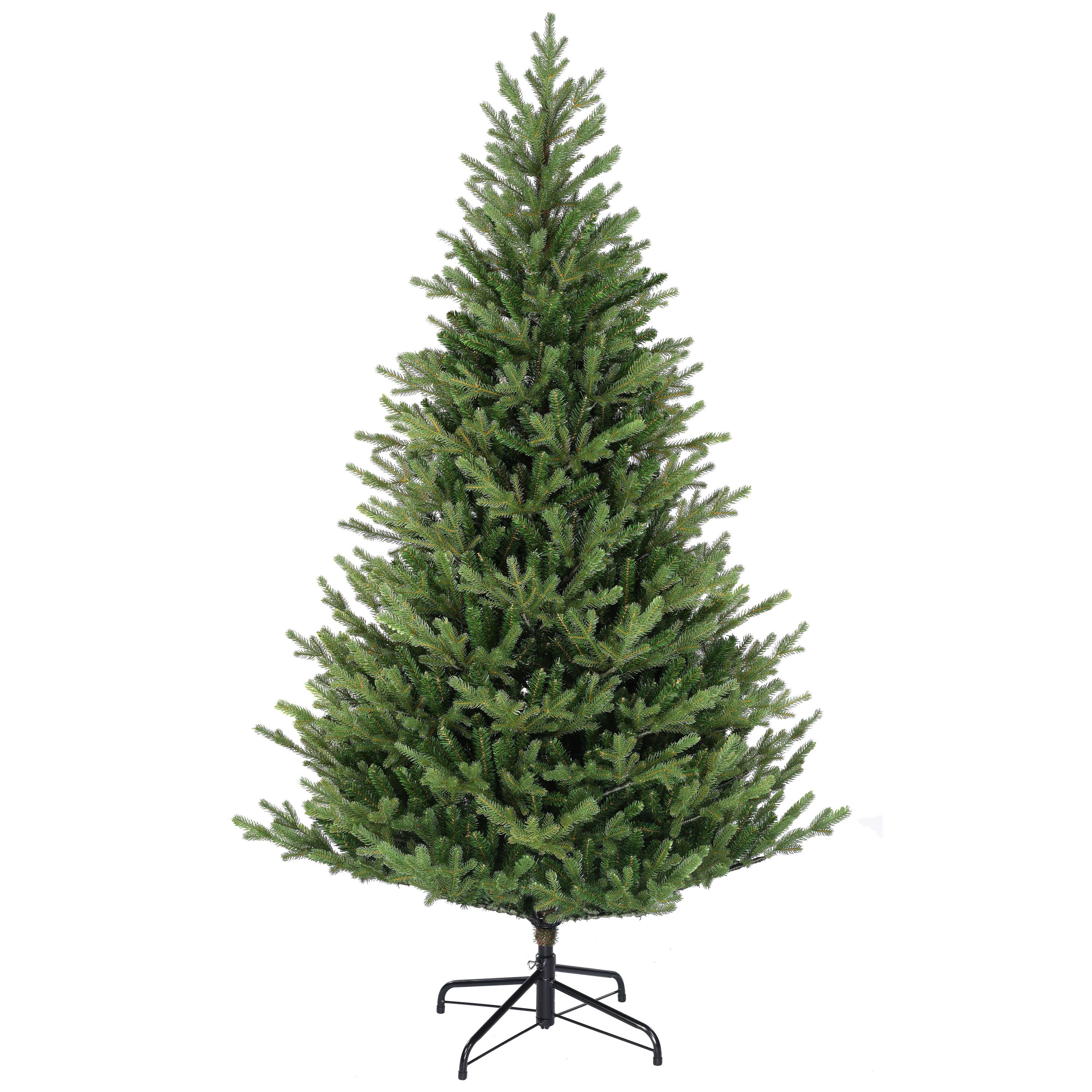 Plastic Christmas tree/fir tree SYDNEY in colour green with metal stand consisting of PE needles. The approx. 230 cm high Christmas tree has a diameter of approx. 150 cm and will be suitable as decoration for the living room at home or for restaurants, shop windows, trade fair stands, etc.
