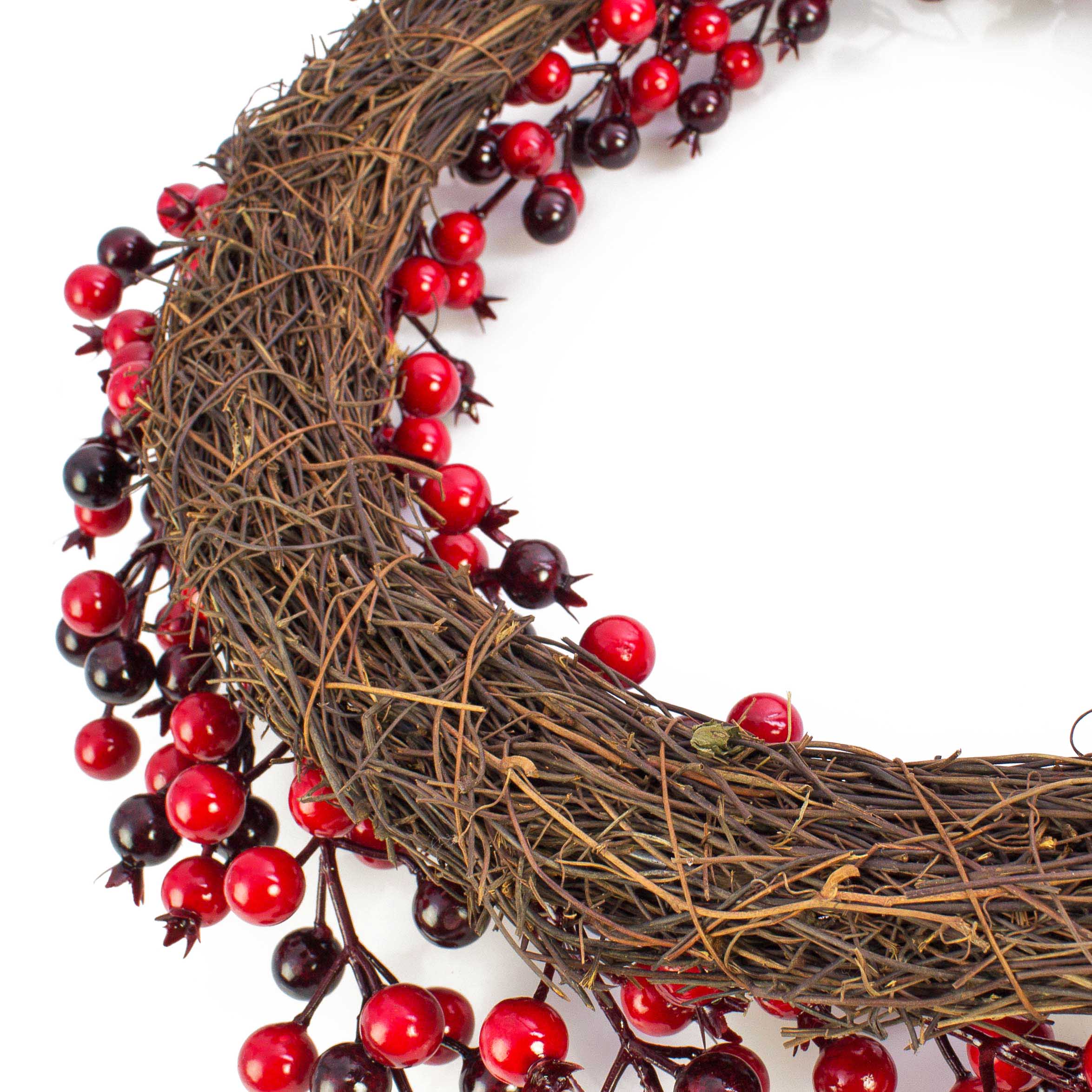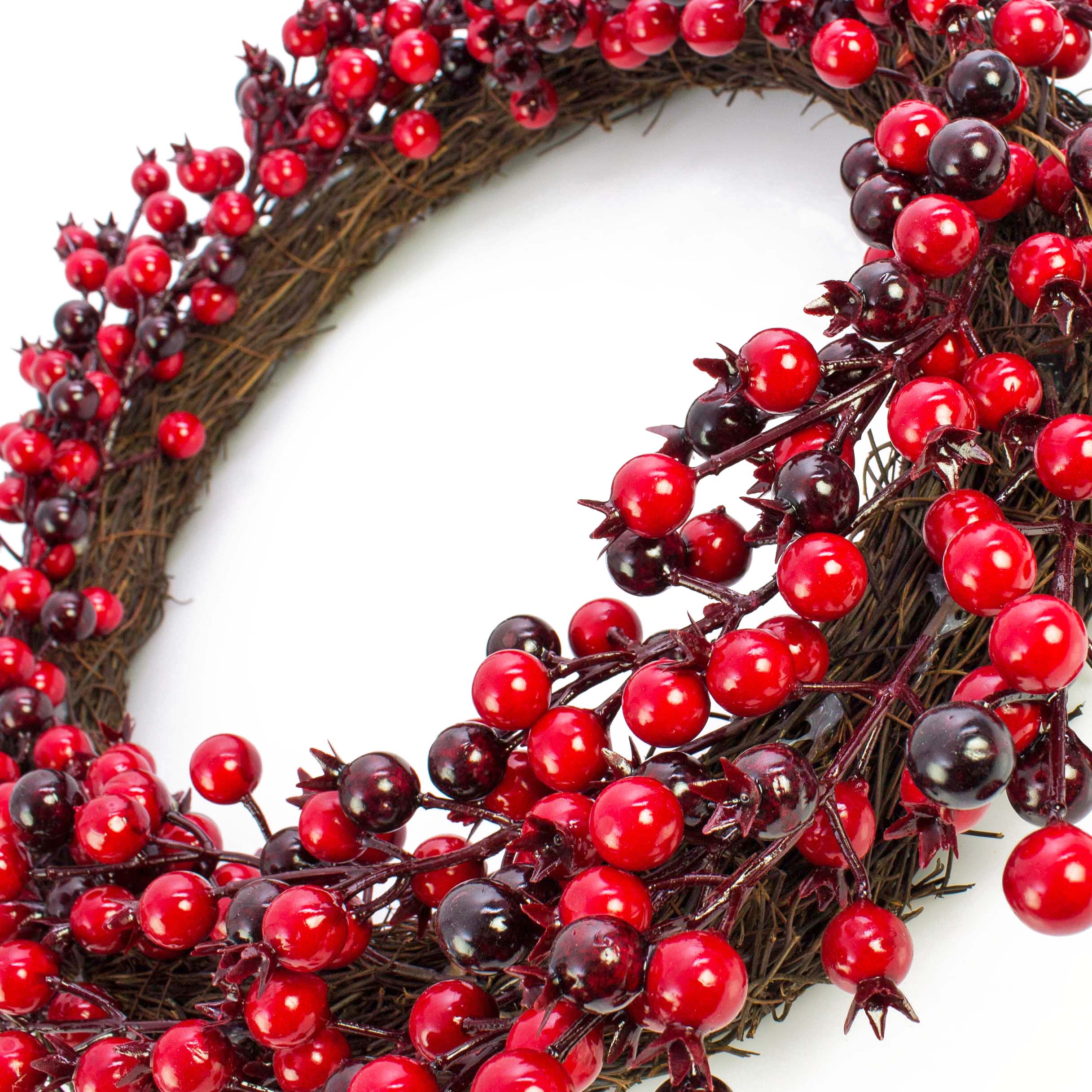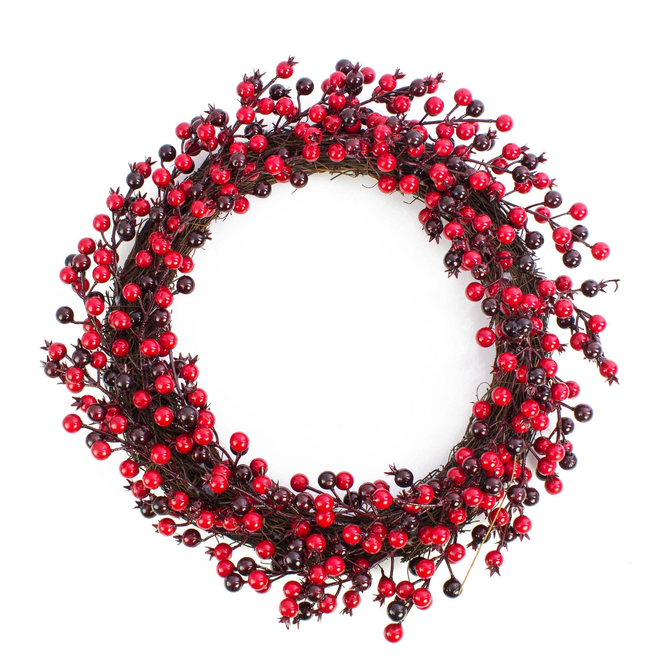Artificial berry wreath in red-wine red with an outer diameter of approx. 45 cm. The artificial wreath will decorate your door or wall e.g. as autumn or winter decoration.