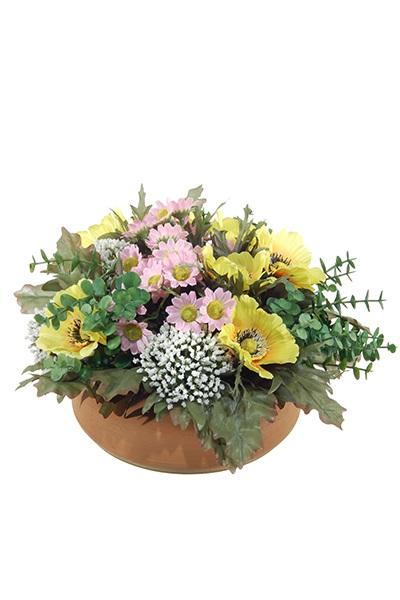 Artificial flower arrangement of anemone and astilbe IGNATIO on plate, yellow-pink, 6.7"/17cm, Ø 11"/28cm