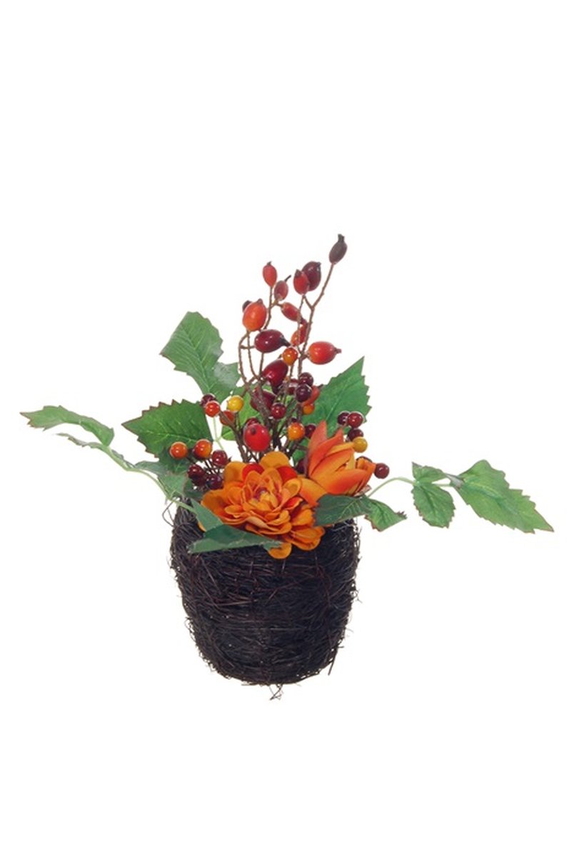 Artificial flower arrangement of dahlia and rosehips ABED in a basket, orange-red, 6.7"/17cm, Ø 3.9"/10cm