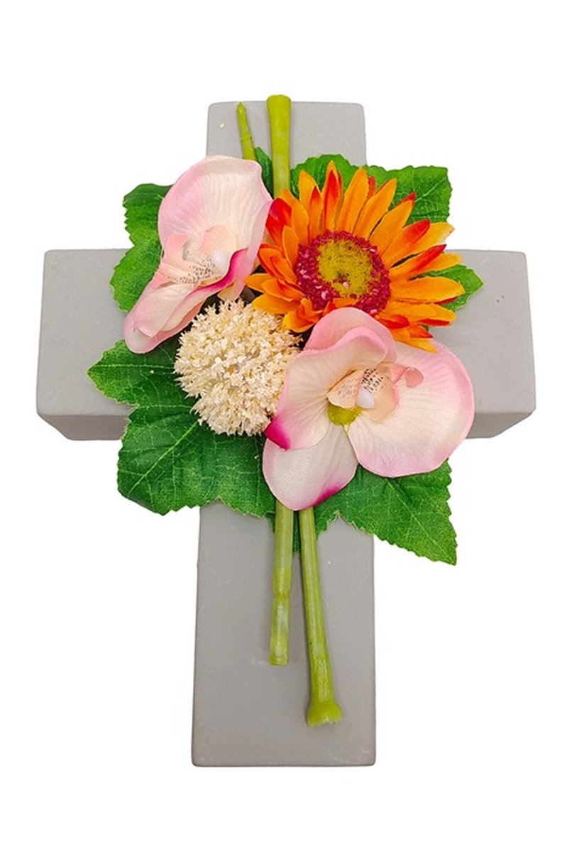 - The tasteful flower arrangement on a cross will be a beautiful enrichment e.g. for the grave decoration, please note that we can give no guarantee for the longevity and durability in the outdoor area, the artificial flowers can discolour due to UV radiation, become brittle or tear off by wind!