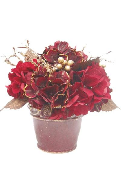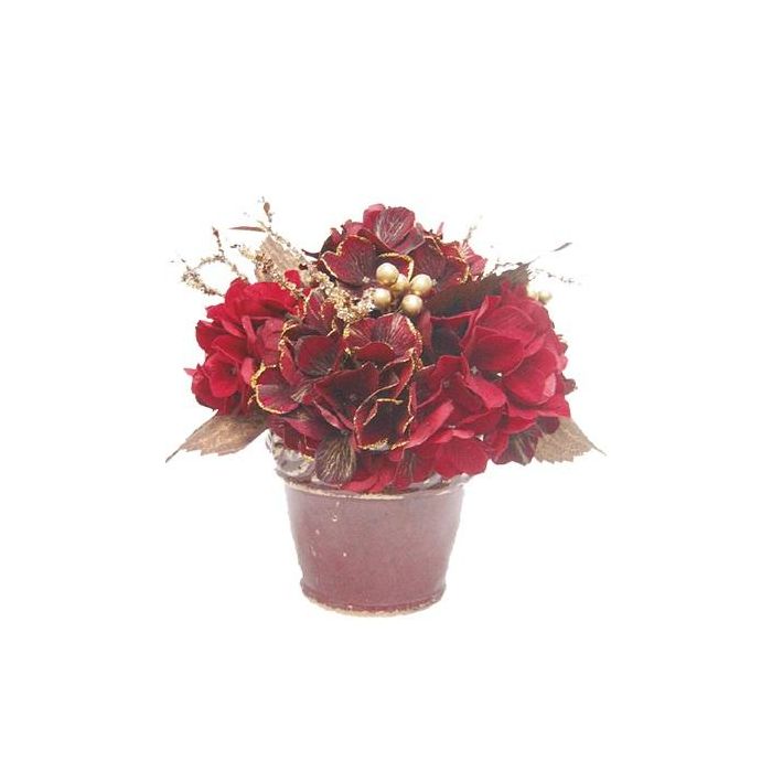 Artificial flower arrangement of hydrangea and berry SUKI, decorative pot, red-gold, Ø 10"/25cm