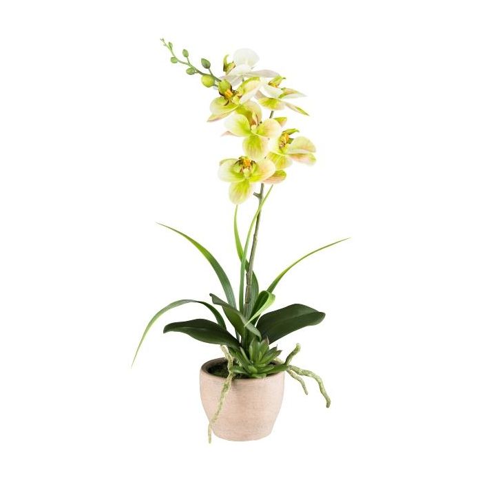 Artificial flower arrangement of orchid and aeonium FININ, grass, cement pot, roots, green-white, 18"/45cm