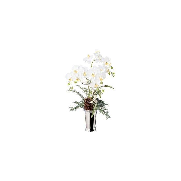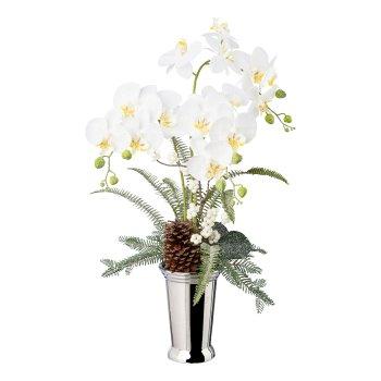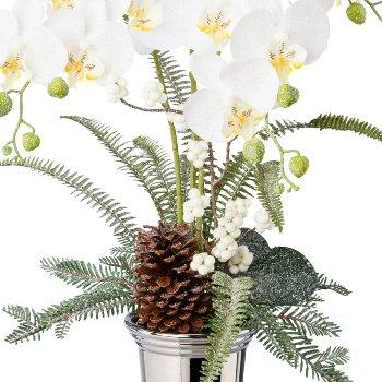 Artificial flower arrangement of orchid and fern BALSI, ceramic vase, cone, berries, snow-covered, white, 28"/70cm