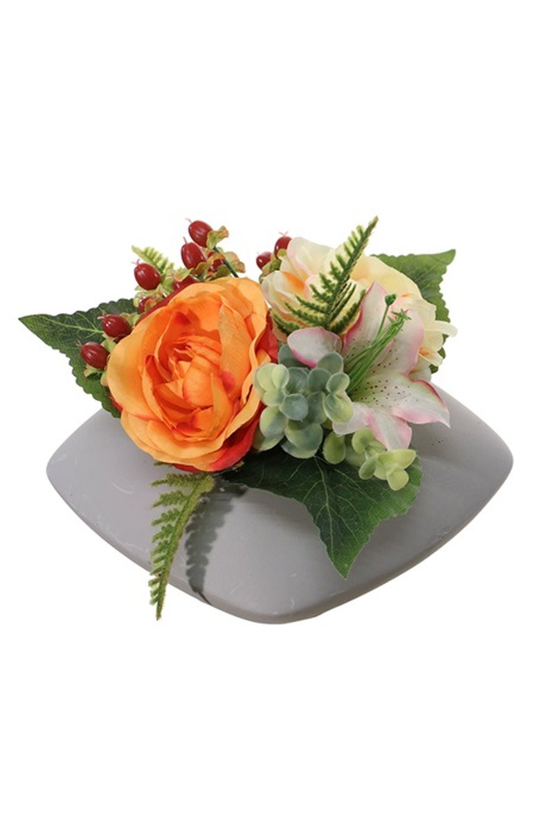 Artificial flower arrangement of ranunculus, lily and St. John's wort DINEKE, decorative pot, orange-yellow-pink, 6.3"/16cm, Ø 8"/21cm