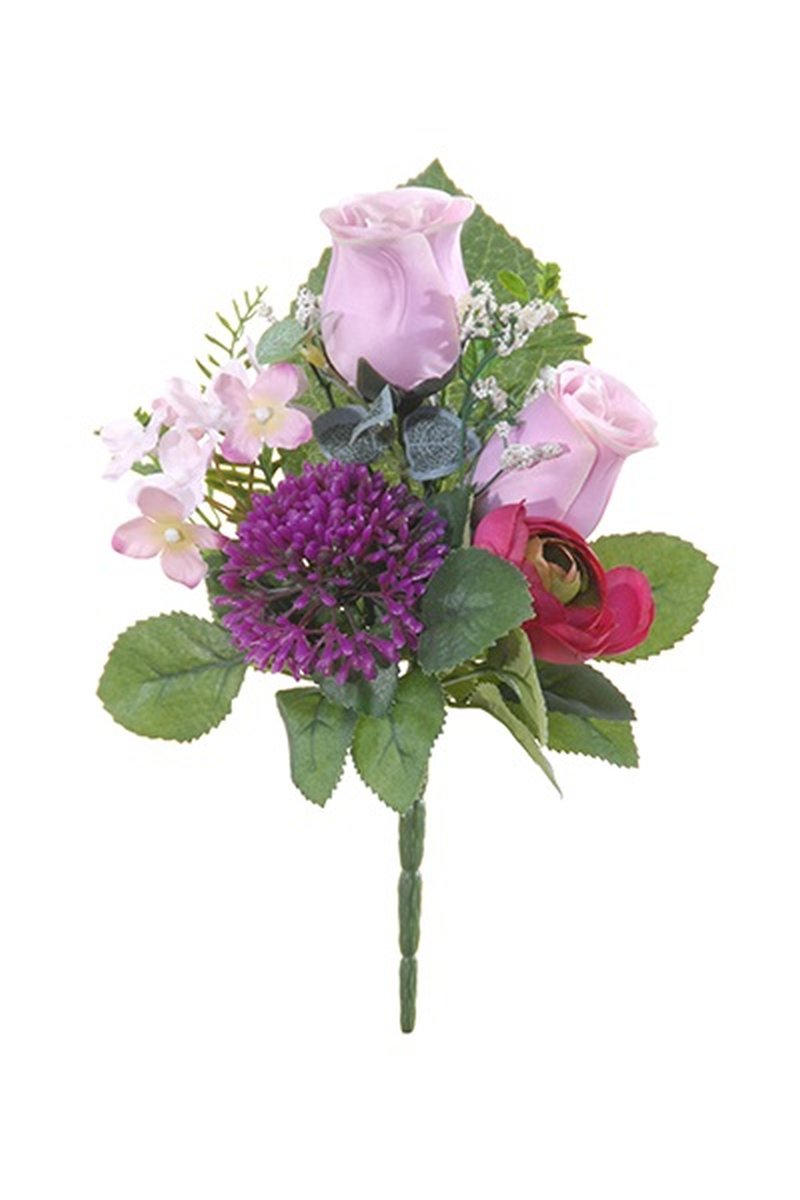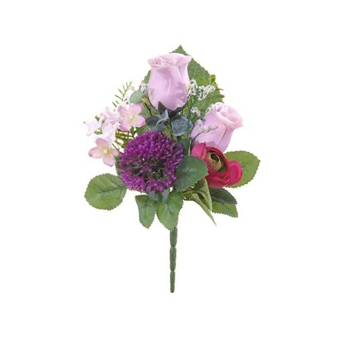 Artificial flower arrangement of rose, ranunculus and allium HOKUNA, spike, lilac-pink-fuchsia, 11"/27cm, Ø 8"/20cm