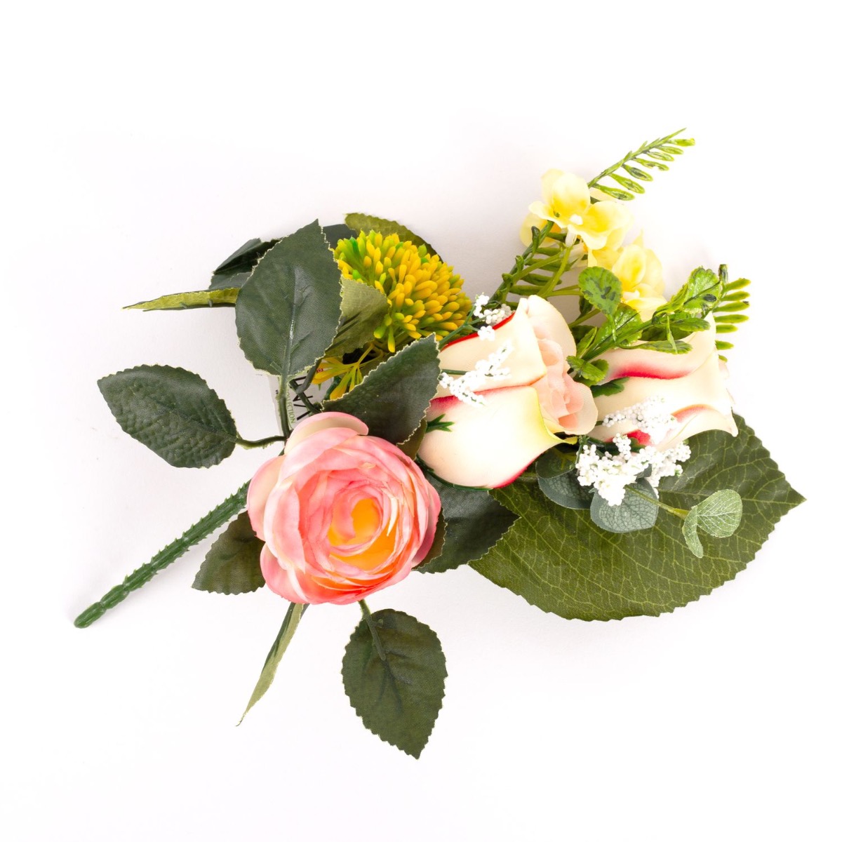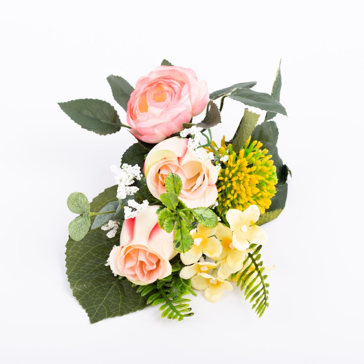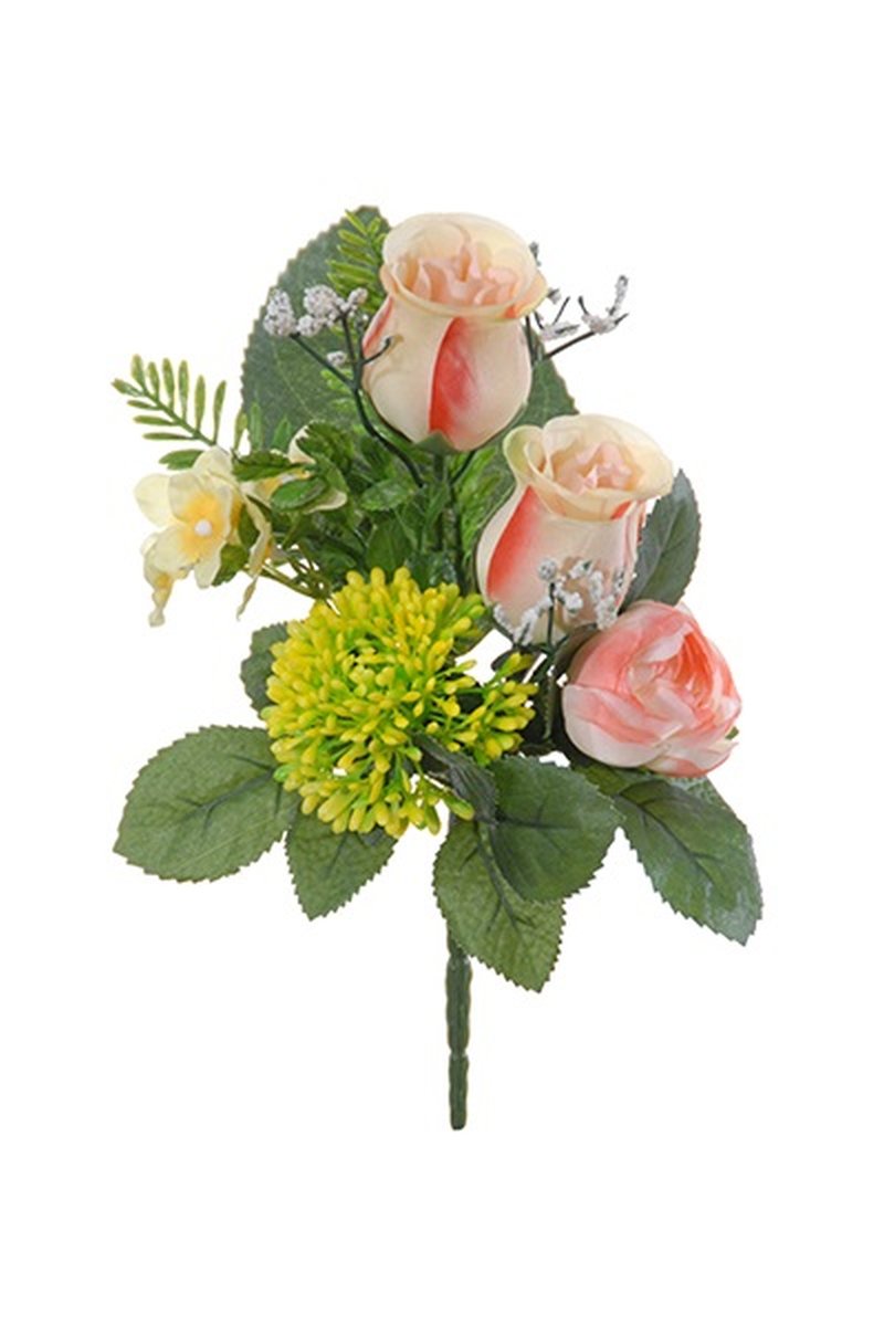 Artificial flower arrangement of rose, ranunculus and allium HOKUNA, spike, pink-yellow, 11"/27cm, Ø 8"/20cm