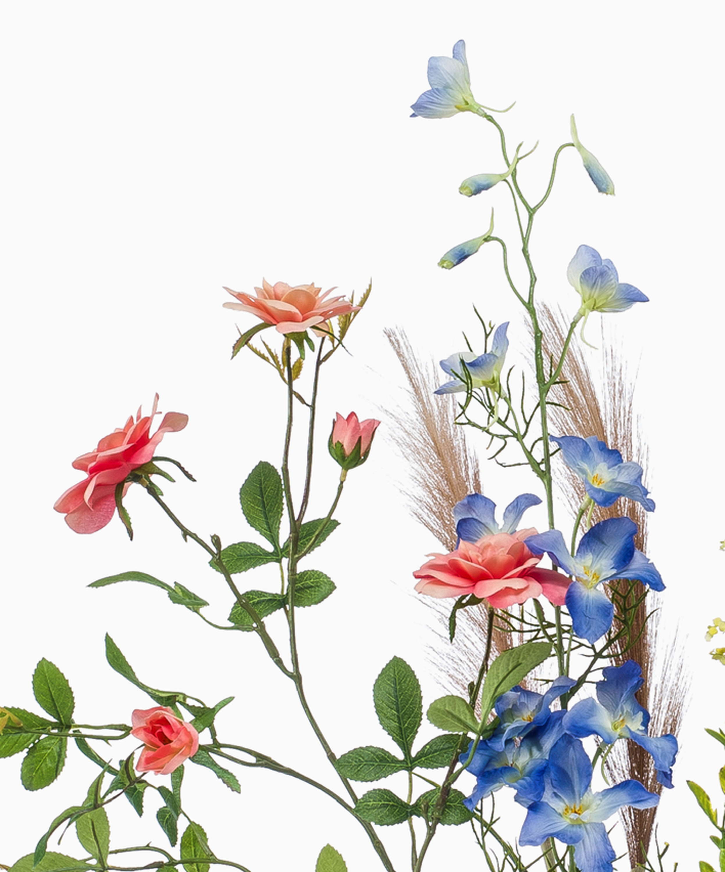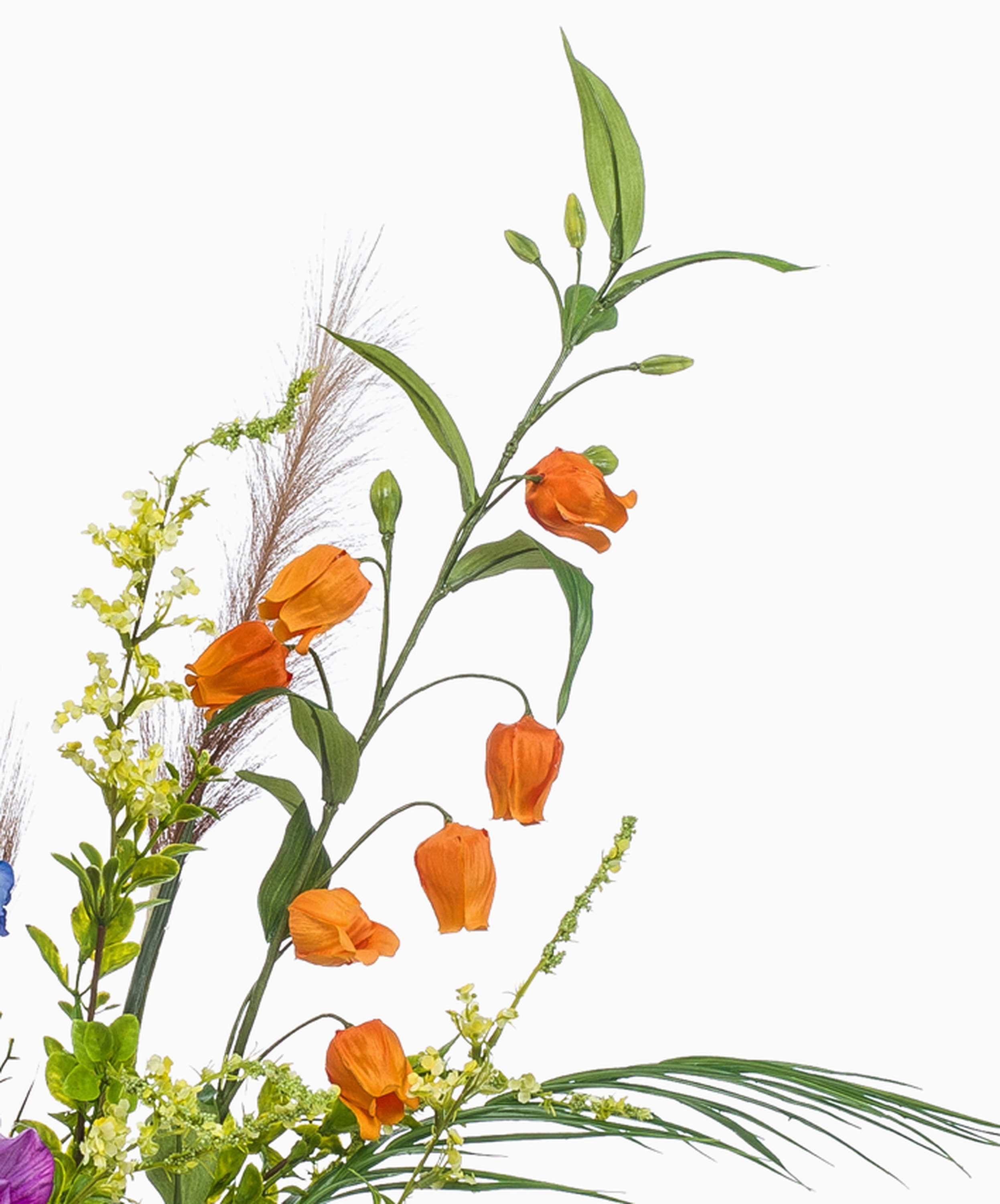 - Art bouquet consisting of delphinium, lantern lily, rose, anemone, pampas grass and areca in colourful