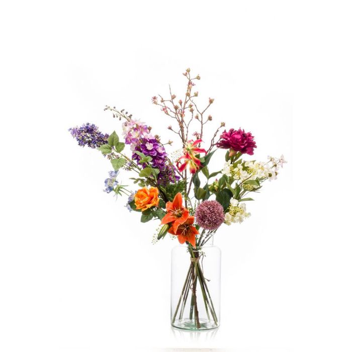 The hand-bound artificial flower arrangement FEME unites many different summer flowers in a harmonious interplay. The bright colours of the artificial flower arrangement create a good mood and thus embellish the summer decoration.