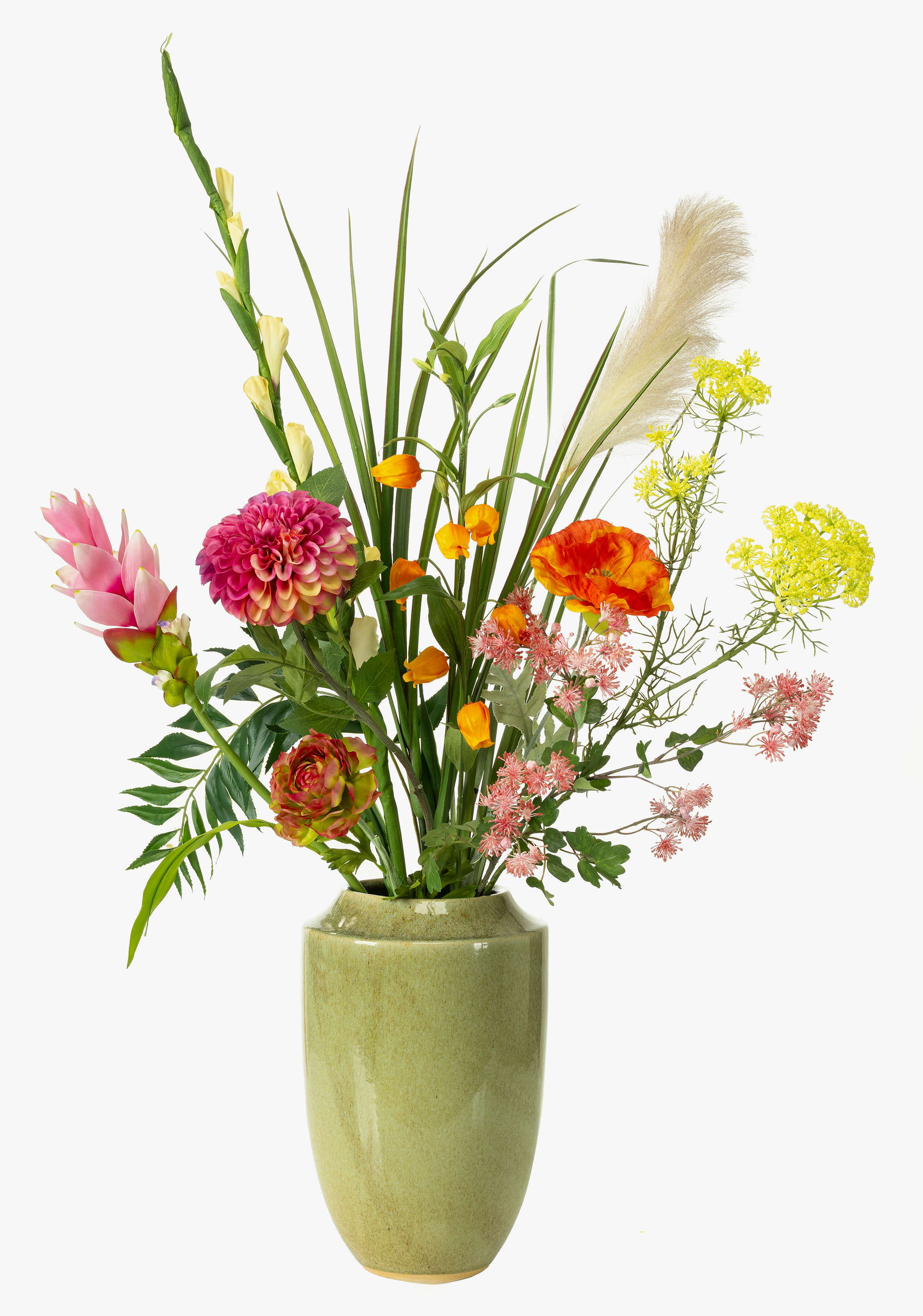 The colourful artificial bouquet FEME will impress with a mix of classic and fancy artificial flowers in fresh pink and orange tones. The pampas grass and gladiolus will give the beautiful ensemble its height of approx. 120 cm, ideally suited for a plain floor vase.
