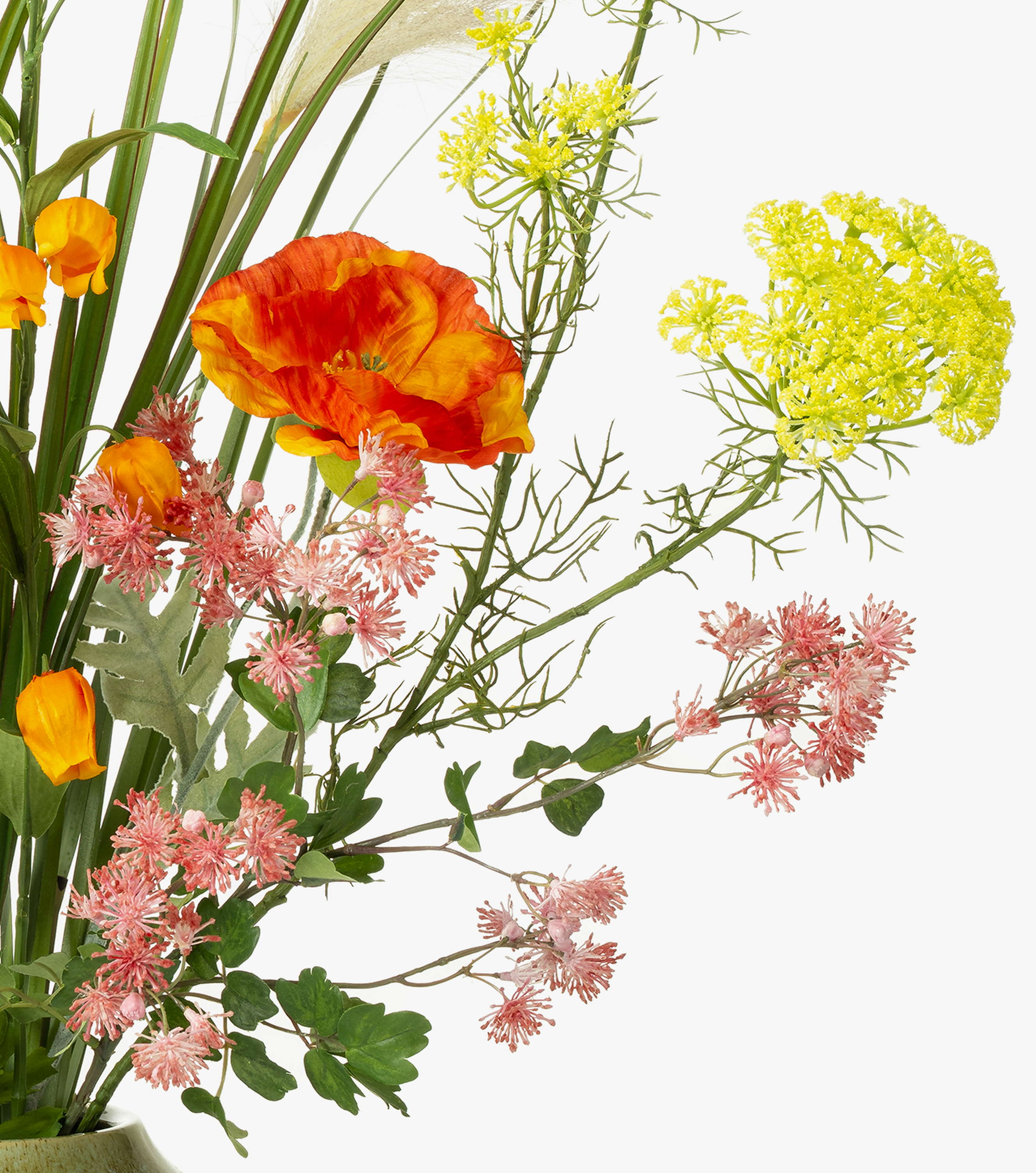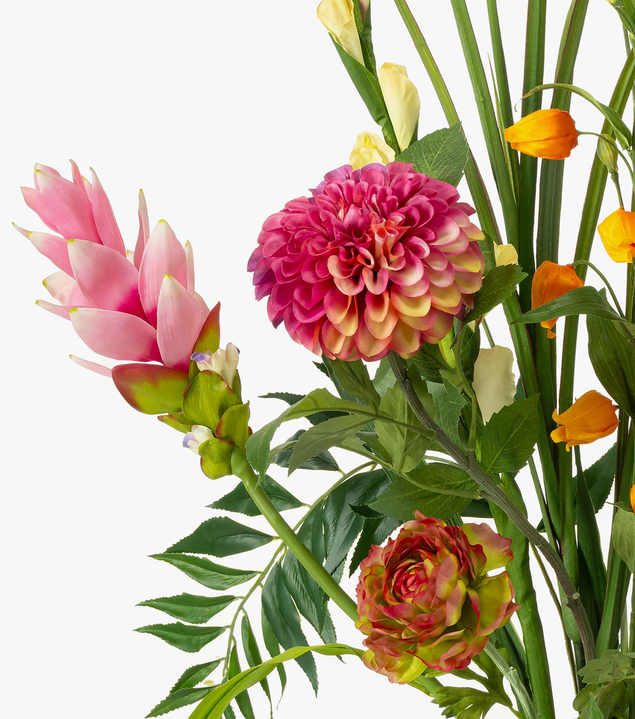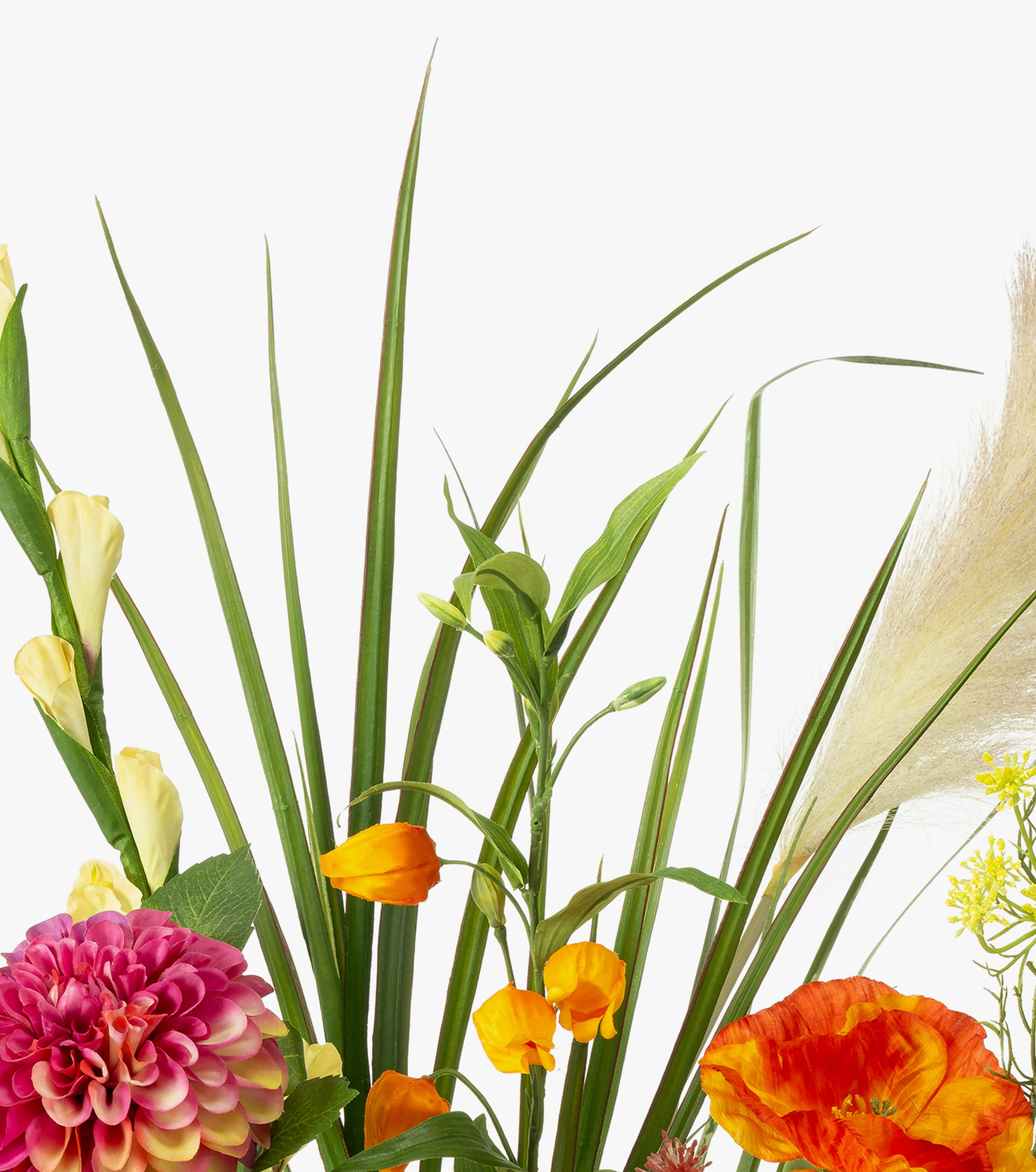 - Artificial bouquet consisting of turmeric, gladiolus, dahlia, poppy, meadowsweet, Chinese lantern lily, ranunculus, hogweed and pampas grass in pink-orange colour
