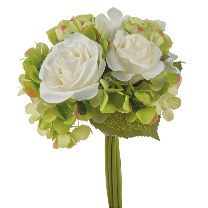 Artificial flower bouquet FOUDILA, roses, hydrangeas, cream-green, 10"/25cm