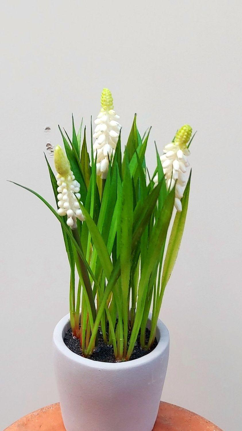 Artificial flower Grape hyacinth NARMADA in a cement pot, white, 8"/20cm