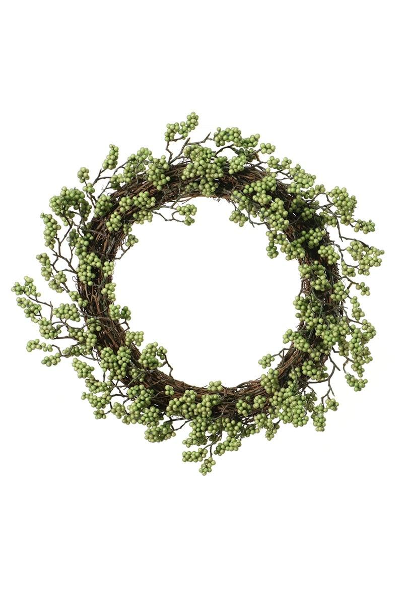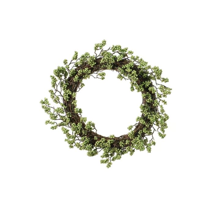 - The numerous green berries are attached to a rattan wreath