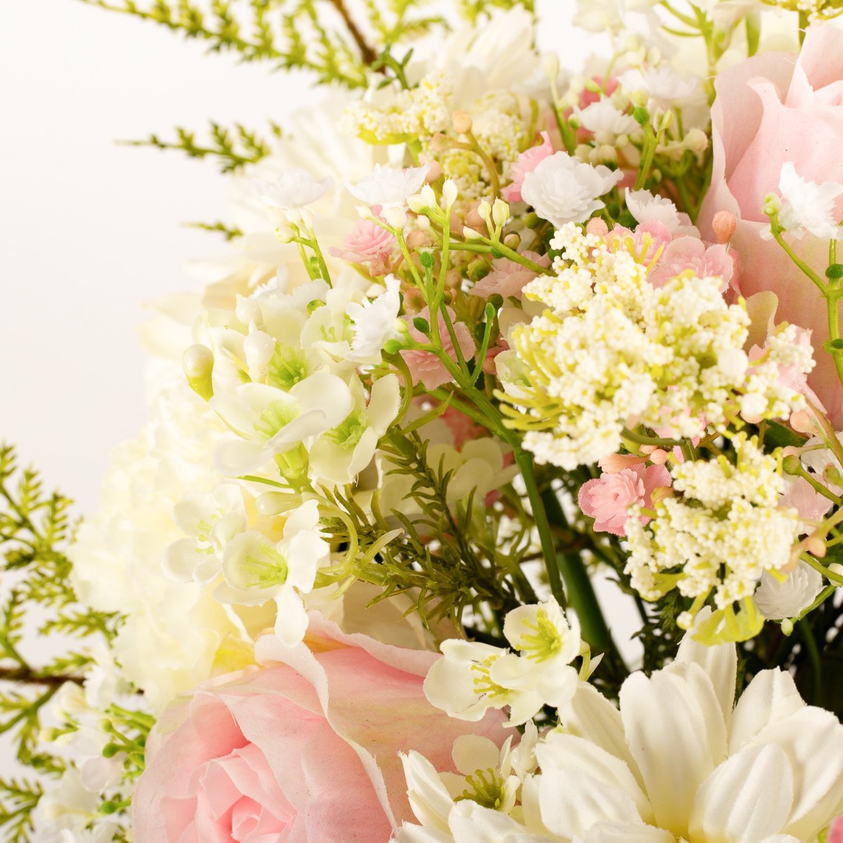 Hand-tied in Germany, this artificial bouquet MALIA consists of a perfectly matching flower combination. The flower bouquet is surrounded by yarrow and baby's breath and finished off with saisonal green of asparagus plumosus. The floral arrangement will be suitable for many occasions, such as for Mother's Day, Women's Day, birthday or simply as a small gift for any loved one.