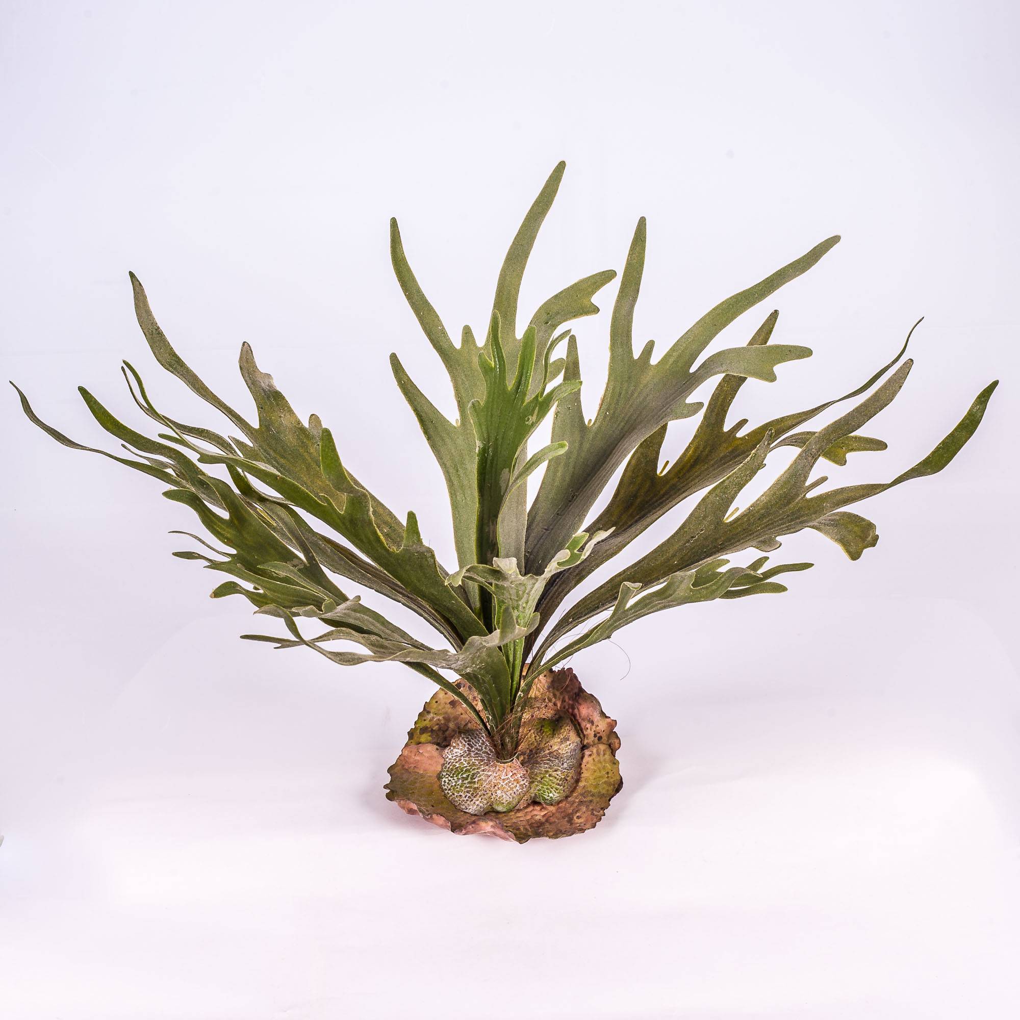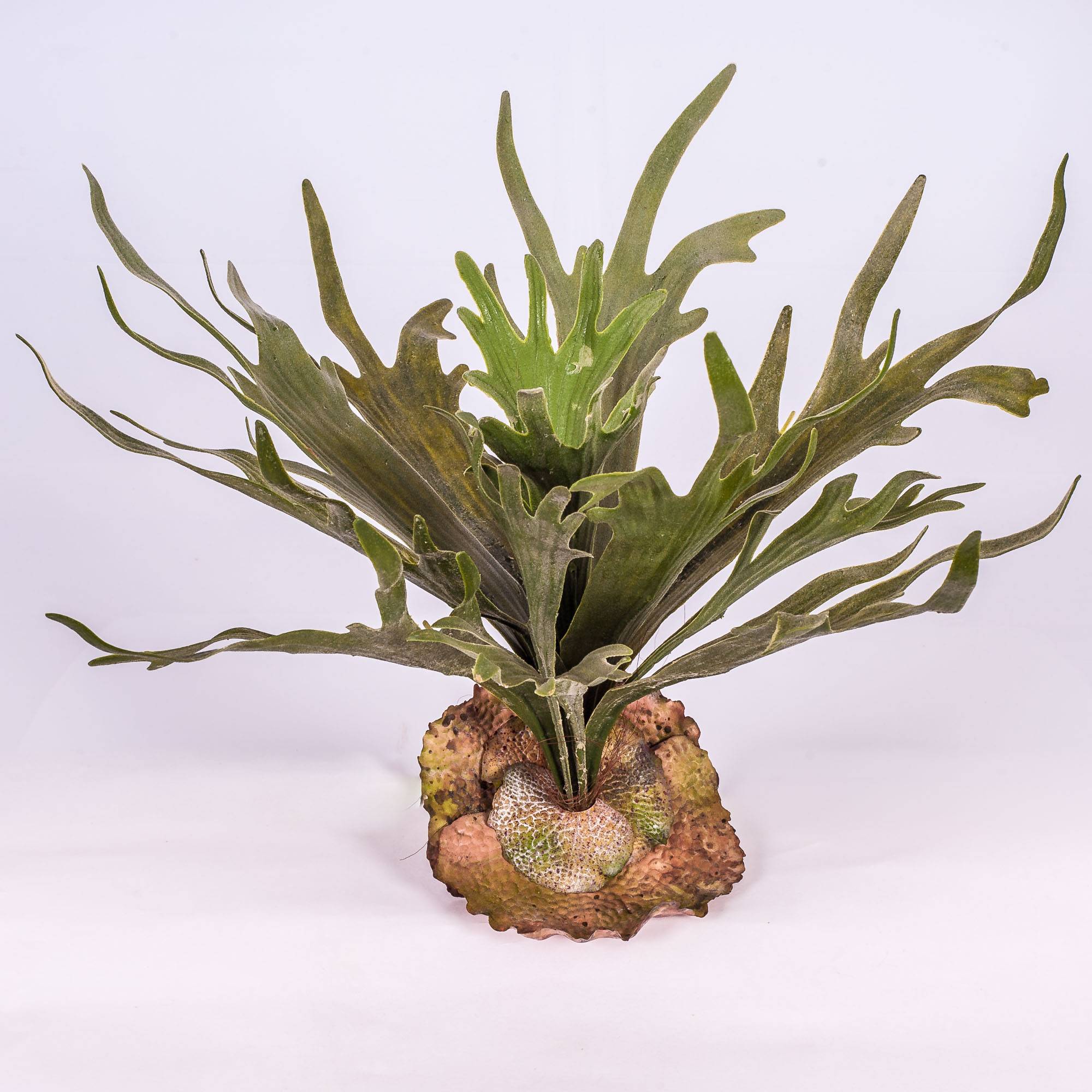 - with 13 leaves / fronds in colour: light and dark green, some round brown bottom leaves