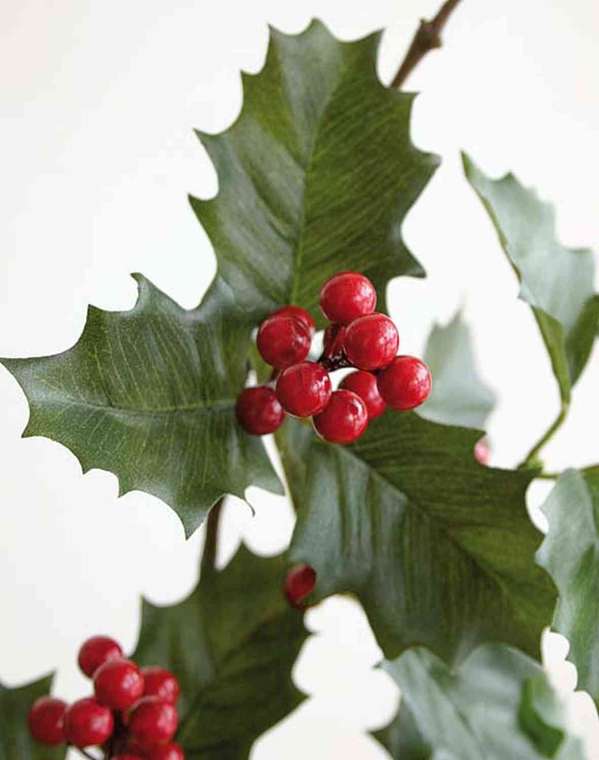 Artificial holly YUKARI with red berries and natural-looking textile leaves in green colour. The fake holly branch measures approx. 100 cm in length.