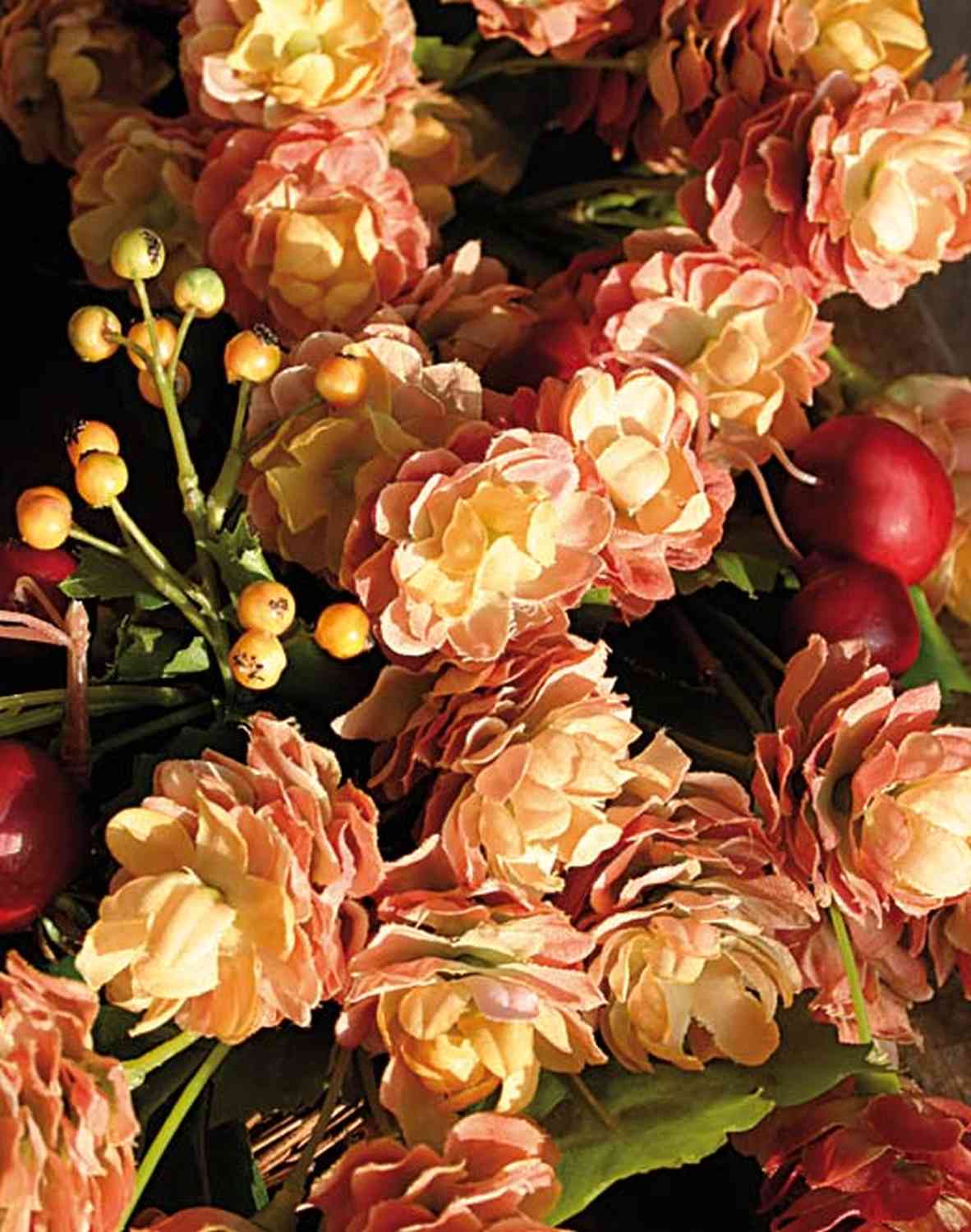 - Orange hop flowers crafted from high-quality textile fibre and holly berries made of synthetic