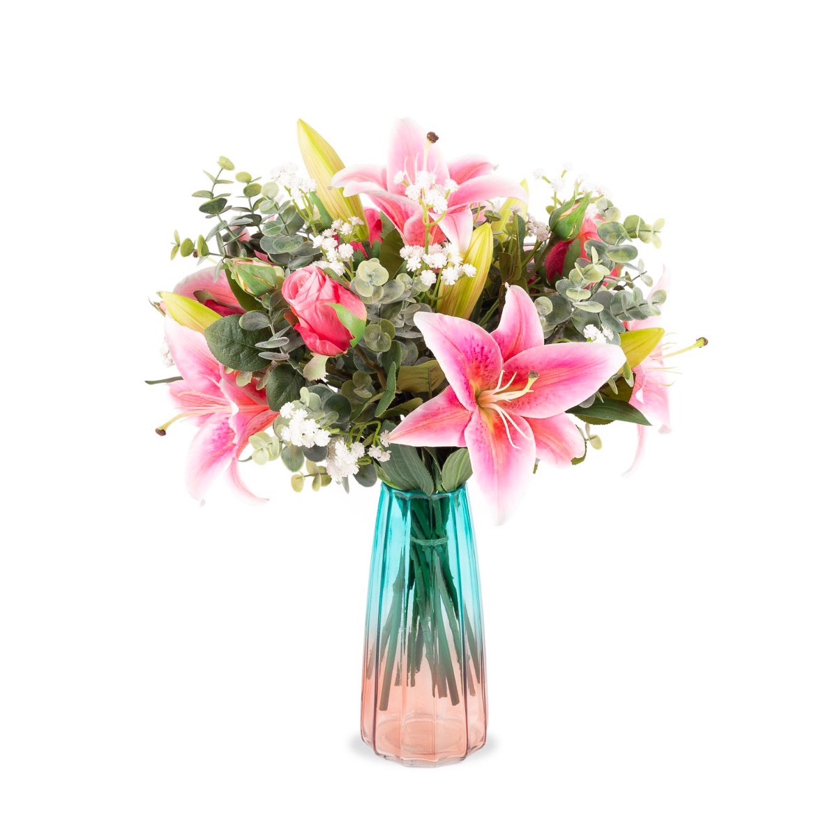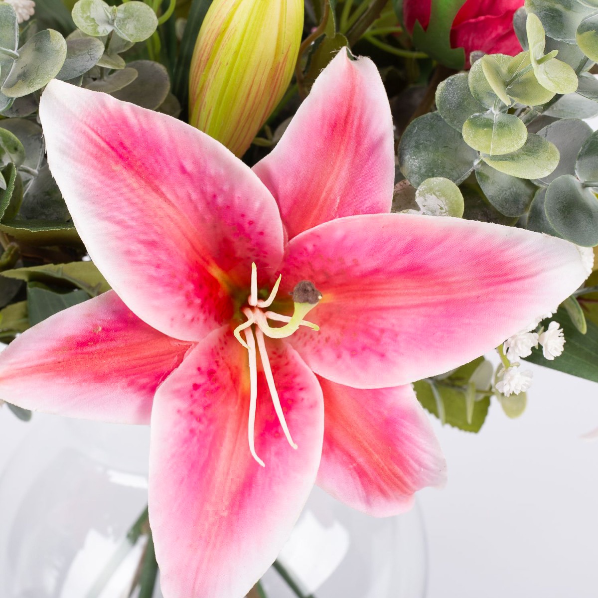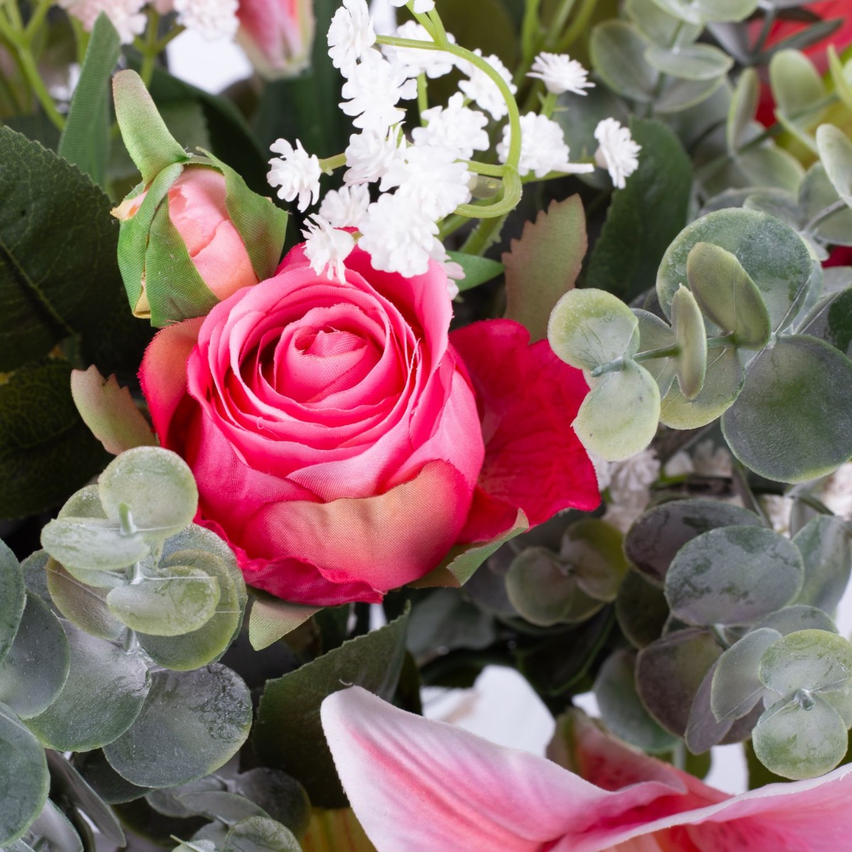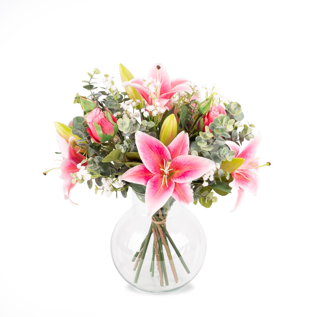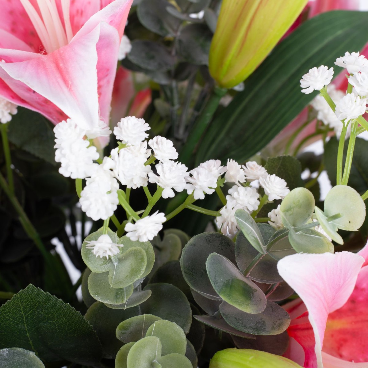The elegant artificial bouquet MARIPOSA of pink lilies and roses stands for femininity and admiration. The flower ensemble can be used as a gift for a best friend, mother, grandma or sister and is rounded off with modern eucalyptus and classic baby's breath branches.