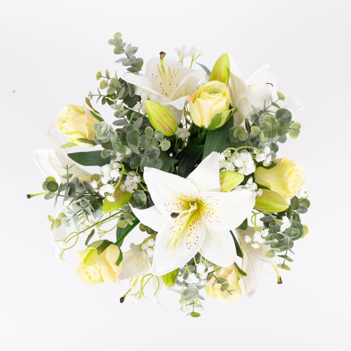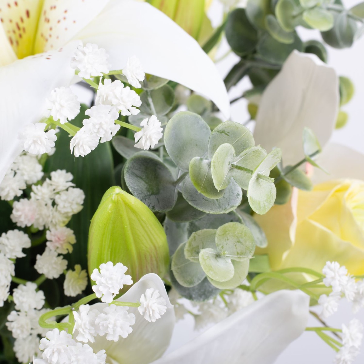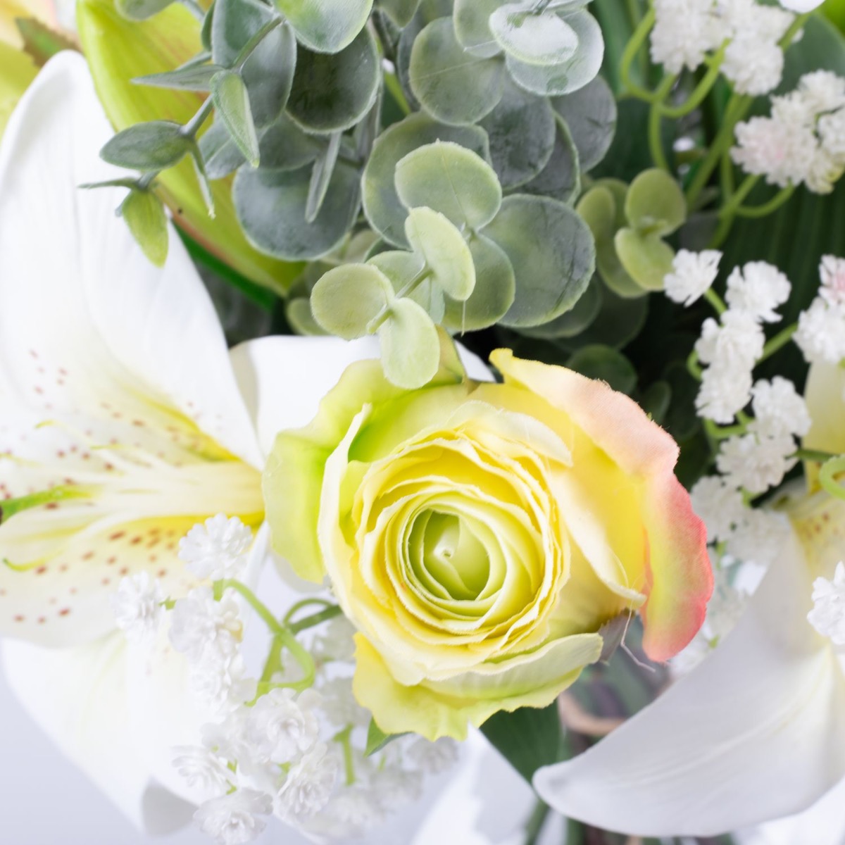 The elegant artificial bouquet MARIPOSA of white lilies and greenish roses stands for rebirth and purity. The flower ensemble is used for weddings as well as funerals and is rounded off by modern eucalyptus and classic baby's breath branches.