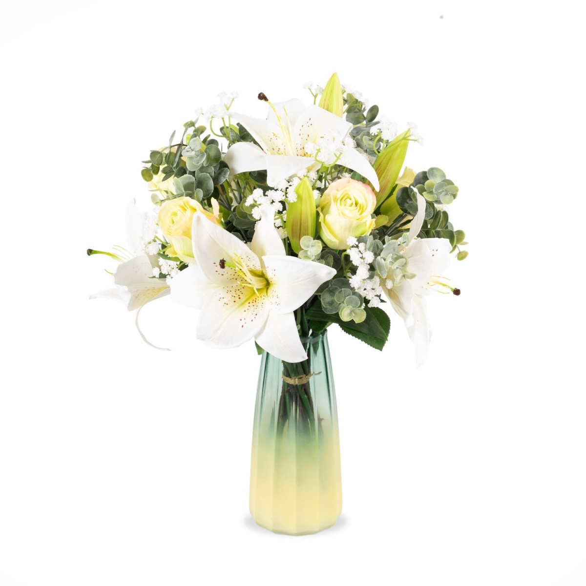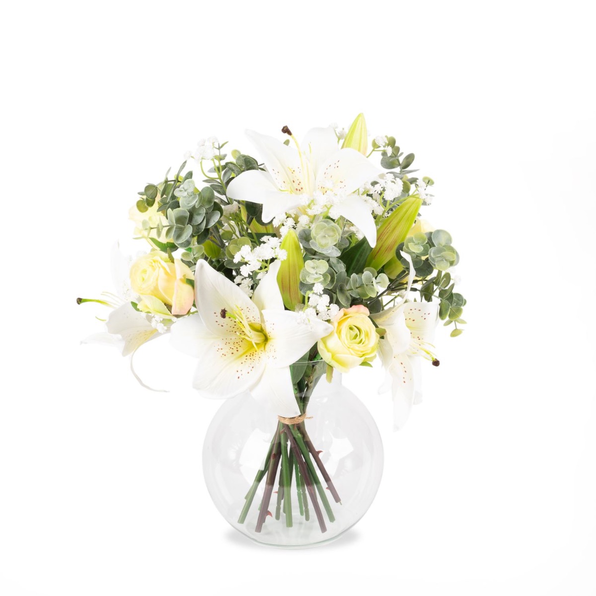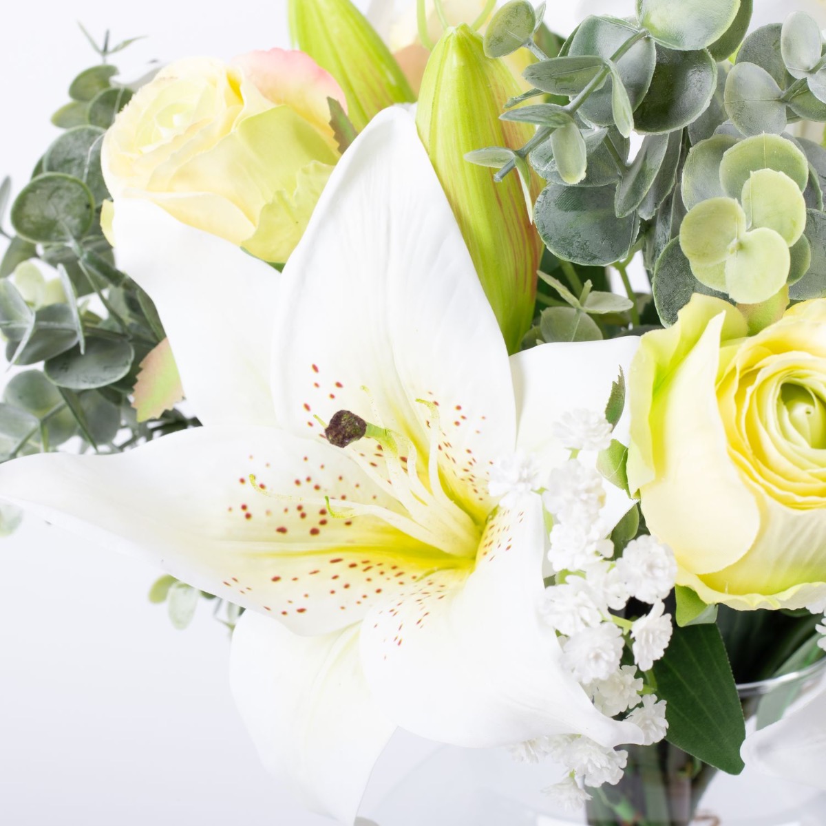 The elegant artificial bouquet MARIPOSA of white lilies and greenish roses stands for rebirth and purity. The flower ensemble is used for weddings as well as funerals and is rounded off by modern eucalyptus and classic baby's breath branches.