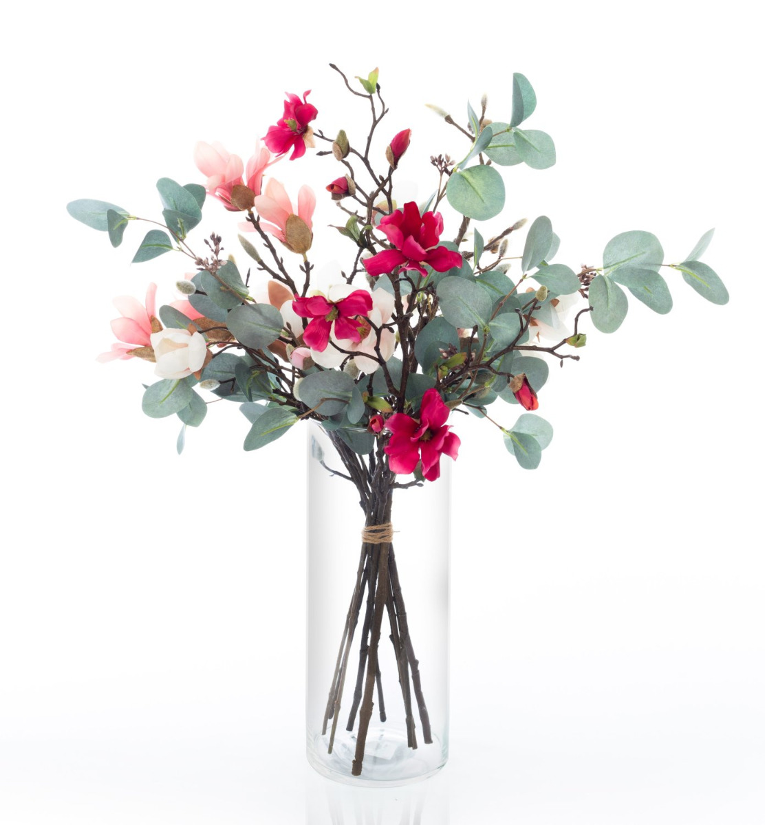 A pretty spring greeting comes with our magnolia bouquet MERISA. The bouquet consists of a large budding branch and different coloured magnolia and star magnolia branches. The abundance of flowers is brightened up by large eucalyptus leaves.
