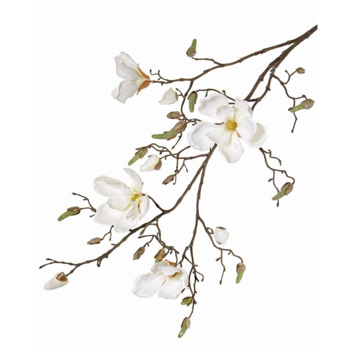 Intricately crafted silk Magnolia spray LORA with 4 open blossoms and 23 buds in flower colour cream-white. The artificial stem measures approx. 4ft/110 cm in length.
