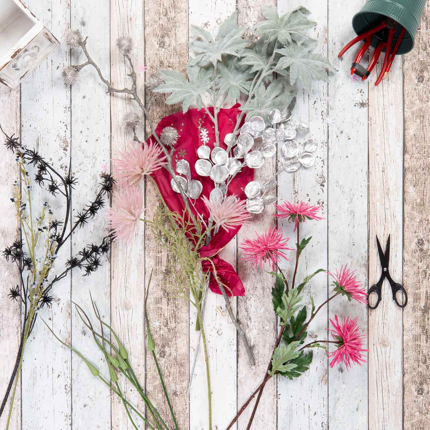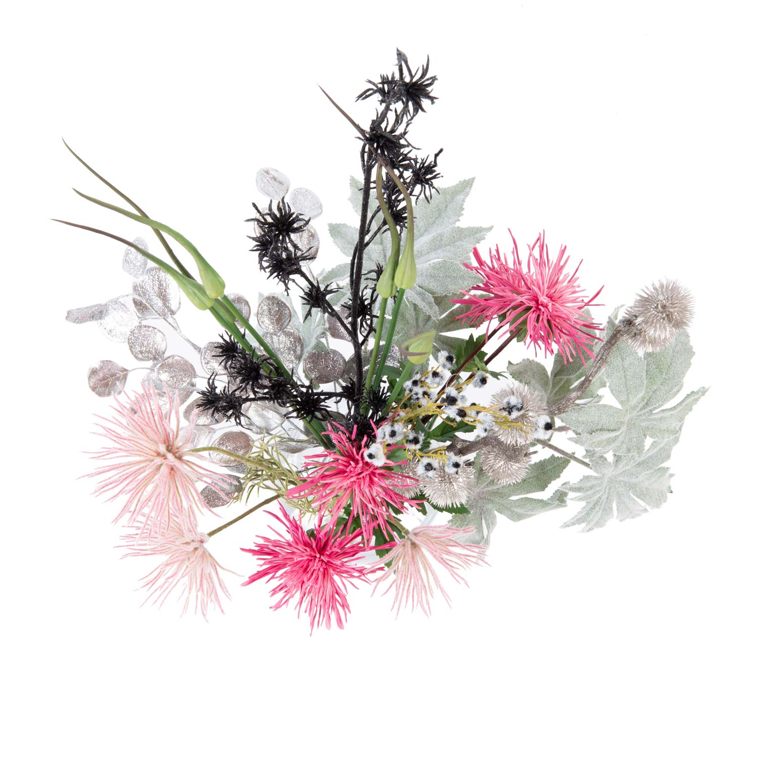 KAAMI means "happiness" in Hawaiian, an absolutely fitting name for our created New Year's Eve bouquet. The combination of the artificial flowers creates a unique firework of blossoms. Ornamental leeks that rise into the air like rockets, chrysanthemums in pink and rose create a flare and witch hazel creates a meteor shower. The floral ensemble spectacle is elegantly and festively framed with glittering silver leaf and fluffy stirlingia and papaya leaves.