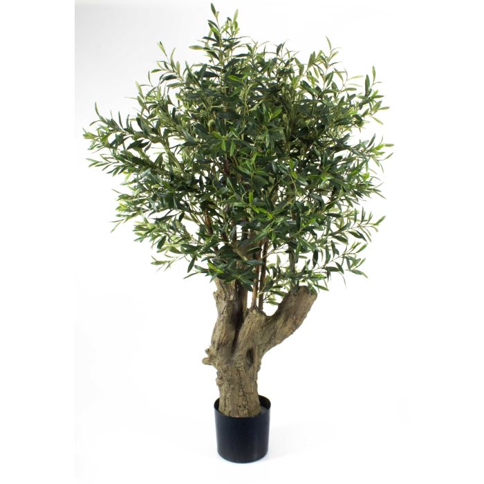 Artificial olive tree with a thick trunk, 3,470 leaves and 42 olives. The tree has a height of approx. 5ft/140 cm and is suitable for outdoor use (weatherproof, UV-resistant).