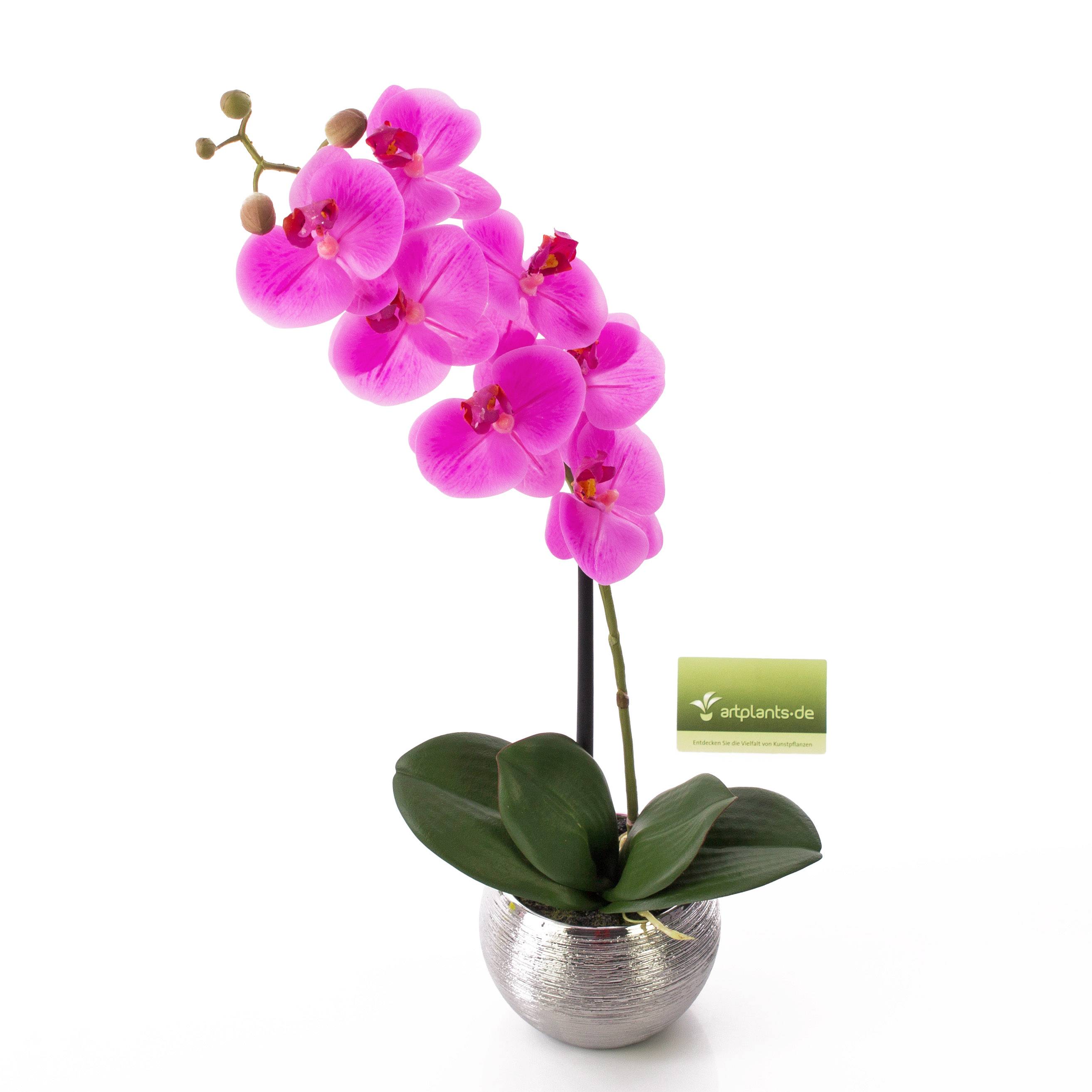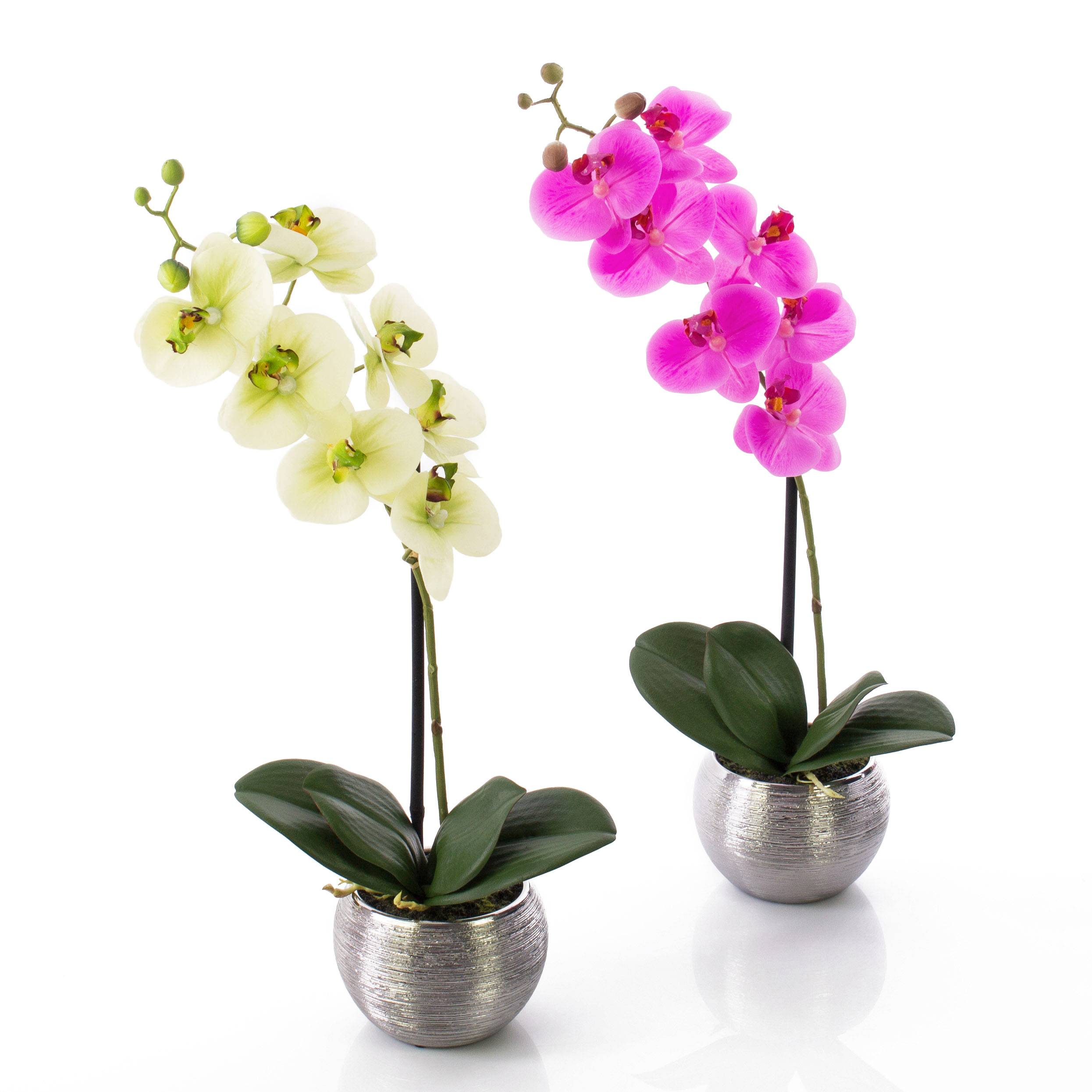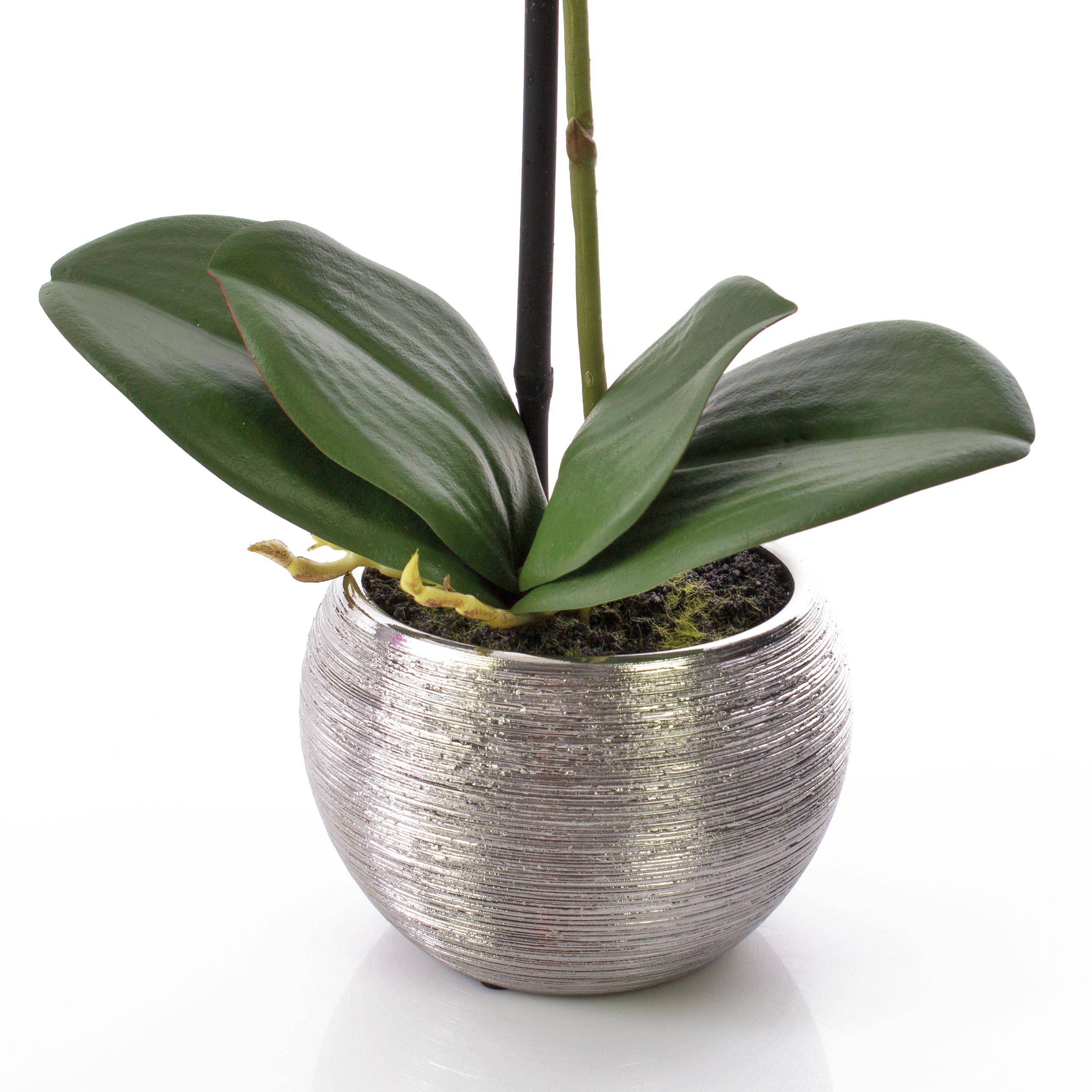 Fake orchid EMILIA in an elegant silver-coloured pot with a textured surface. With a height of approx. 45 cm, the artificial flower will make an ideal gift, or it can also be used for decorating the wall shelf and many other ideas.