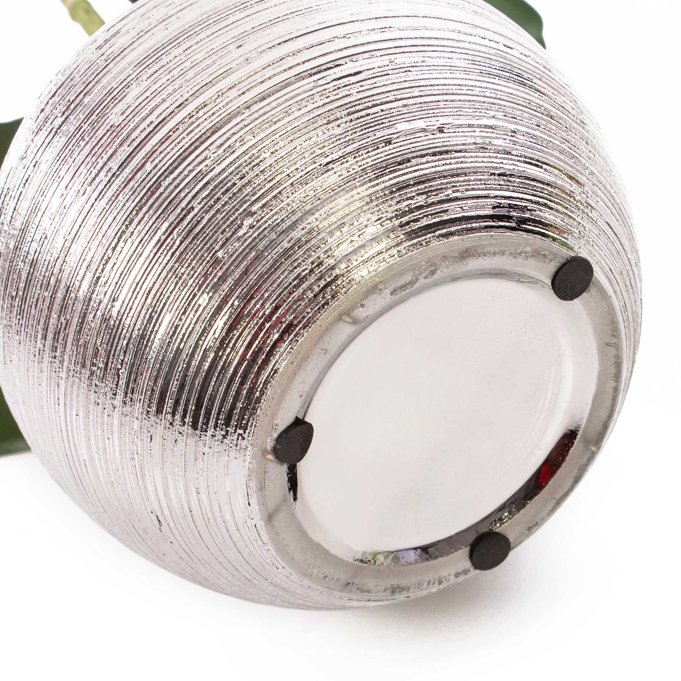 - Delivery in a round pot with fine texture in silver colour; height approx. 8,5 cm, diameter at the top approx. 10 cm, at the centre approx. 11,5 cm, at the bottom approx. 7 cm